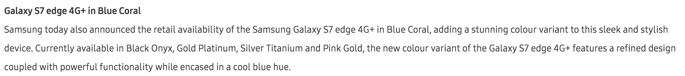 Spekulace o nové barvě modelu Galaxy S7 edge oficiálně potvrdil také Samsung přímo na svých webových stránkách. Novinka s označením Galaxy S7 edge 4G+ bude k dispozici v modré Blue Coral varaintě, která doplní kvarteto současných barev. Ve světě se začně prodávat už 5. listopadu a cena za 32GB verzi bude 1098 dolarů. Informace o dostupnosti této verze na českém trhu v tuto chvíli ověřujeme u českého zastoupení značky.