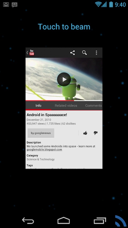 Jestliže máte v telefonu otevřenou webovou stránku, mapu nebo jiný obsah, stačí k němu pouze přiložit jiný telefon s podporou NFC, na který obsah snadno nasdílíte. Podobně to bude fungovat u spuštěných aplikací – po přiložení druhého telefonu se automaticky otevře Android Market s kartou daného programu. Android Beam bude možné integrovat do aplikací třetích stran a už teď jsme zvědavi, jak ji vývojáři dokážou využít.