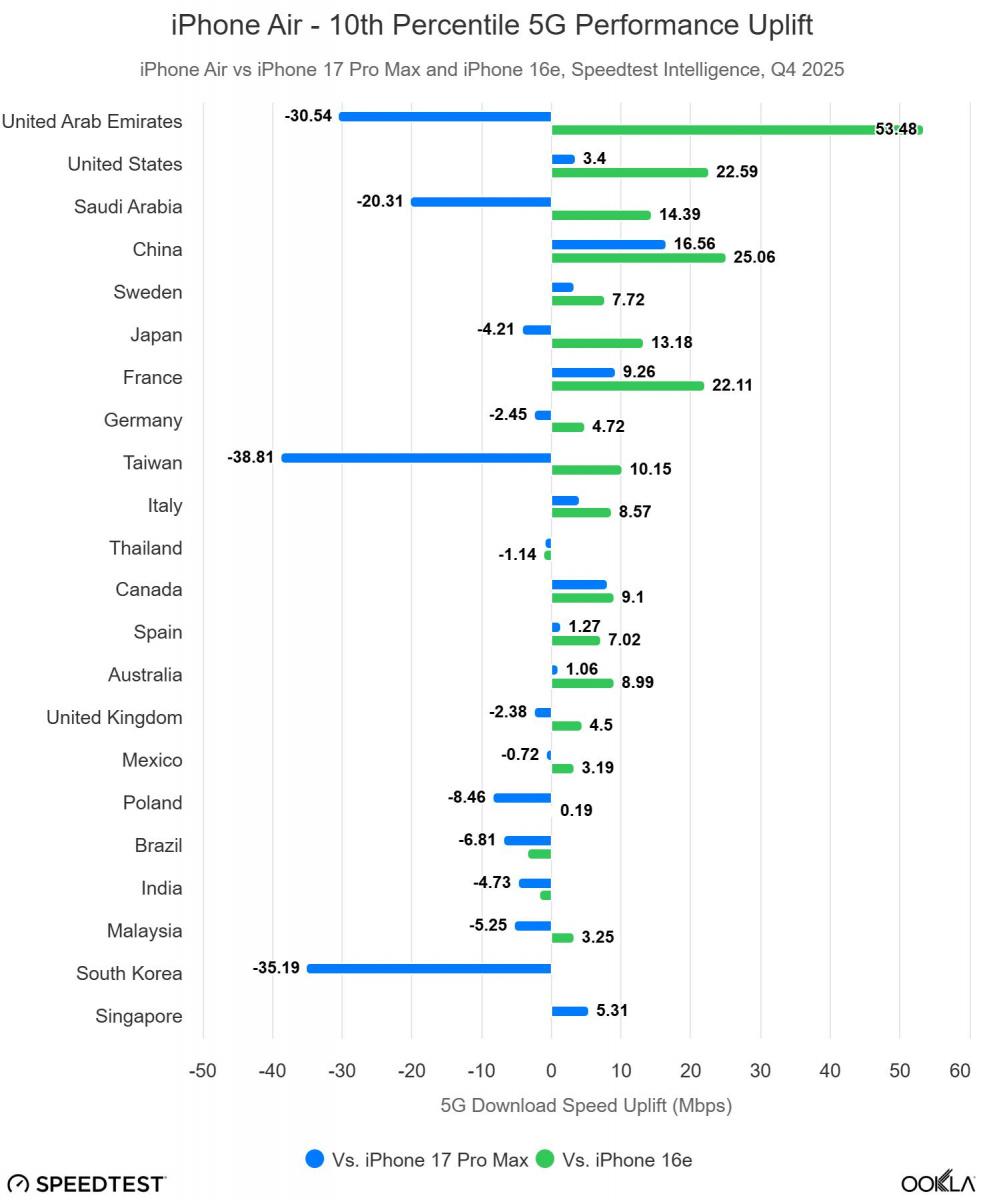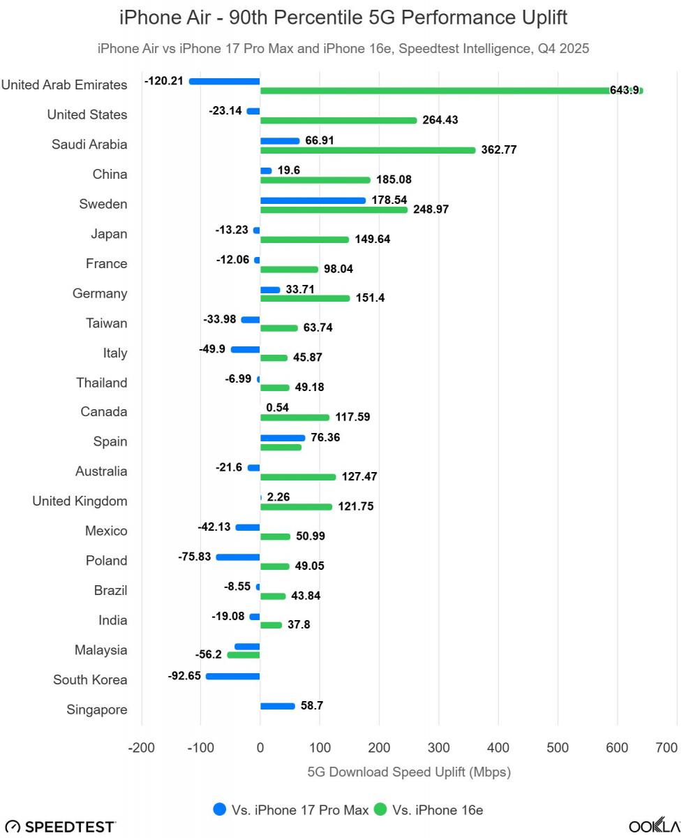 Aplikace Speedtest pochopitelně prozradila nejen podíly jednotlivých iPhonů, ale rovněž odhalila výkonnost vlastního 5G modemu Apple C1X, kterým Apple u iPhonu Air nahradil dříve používané modemy od Qualcommu. Jablečný modem si v testech nevedl vůbec špatně – v rychlosti stahování se prakticky vyrovnal modemu Snapdragon X80 v iPhonu 17 Pro Max, v latenci jej dokonce na 19 z 22 analyzovaných trzích překonal.