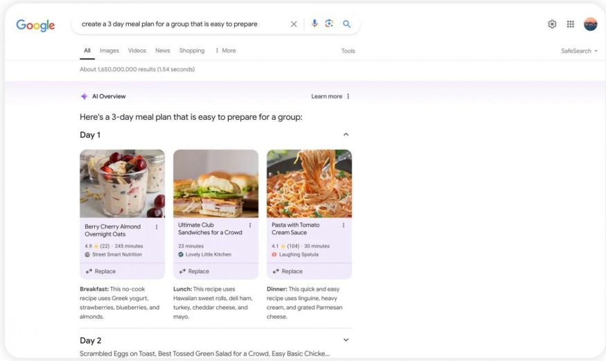 Umělá inteligence ve vyhledávači Google vám dokáže poradit i s plánováním různých věcí, například jídla nebo cestování. Na konferenci I/O například vyhledávač vyřešil naplánování 3denního jídelníčku pro skupinu osob, který nebude obtížné připravit. Dotaz lze pak následně ještě zpřesňovat, například požadavkem, aby byl jídelníček vegetariánský. Google nabídne recepty z různých webů, které lze poté exportovat do Dokumentů Google nebo do Gmailu.