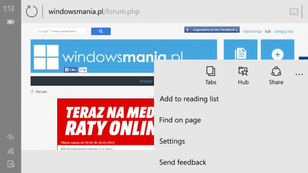 Ve spodní liště se nachází tlačítka pro zobrazení záložek, pro ukládání stránek do “Hubu” (patrně pro pozdější offline přečtení), pro rychlé sdílení a klasické tři tečky s další nabídkou. Nebudeme překvapeni, pokud se tato nabídka v budoucích verzích přesune do horního řádku pod tři vodorovné proužky nazývané hamburger.