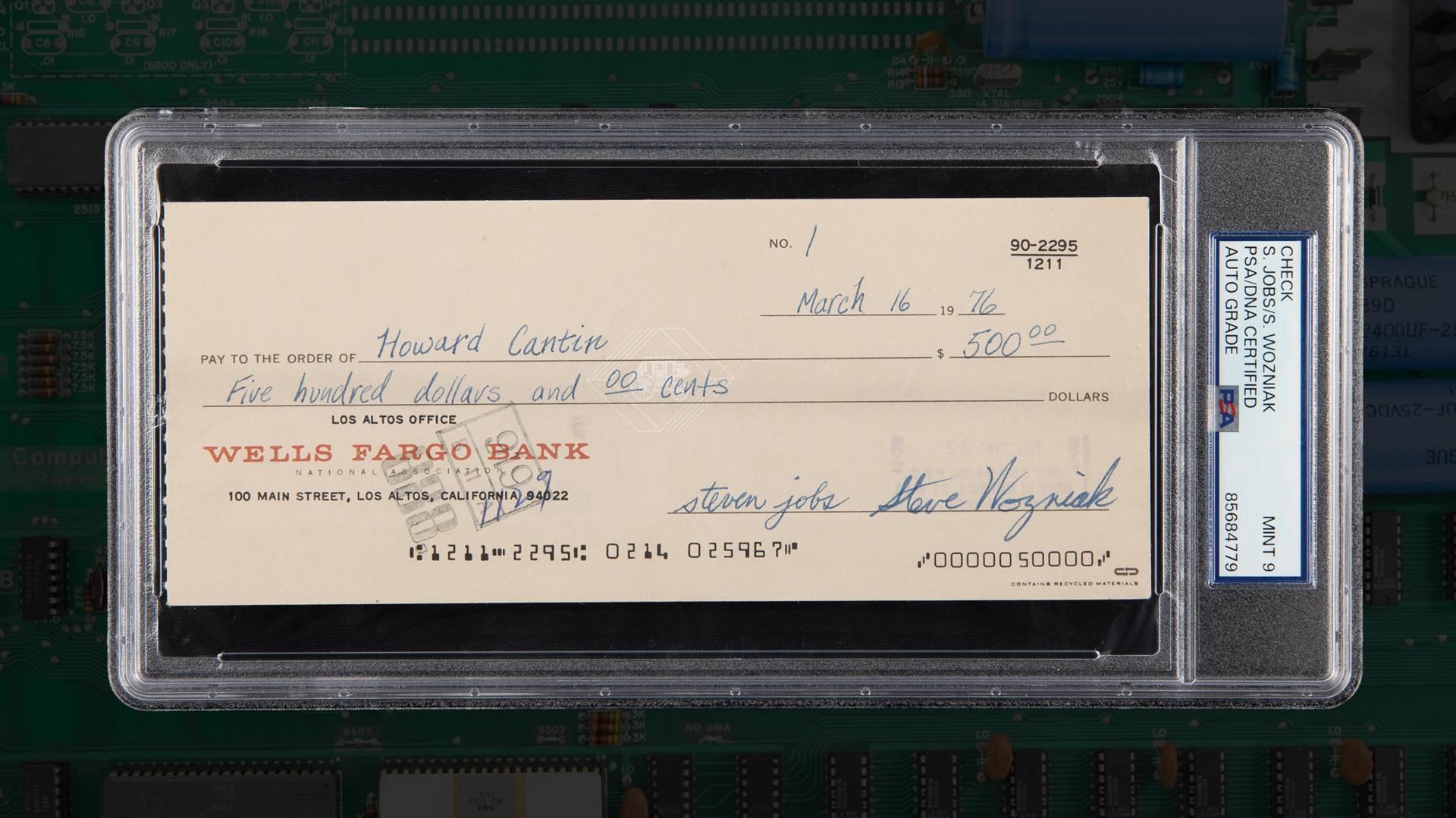 Podepsaný šek tehdy putoval k Howardu Cantinovi, který na základě Wozniakova schématu navrhl výrobní verzi plošného spoje do stolního počítače Apple-1, prvního komerčního produktu jablečné společnosti. Šek s pořadovým číslem 1 vydala americká banka Wells Fargo dne 16. března 1976. Stalo se tak několik týdnů před založením společnosti Apple Computer, k němuž došlo 1. dubna téhož roku. Krátce po vydání šeku Jobs s Wozniakem otevřeli vůbec první bankovní účet Applu.