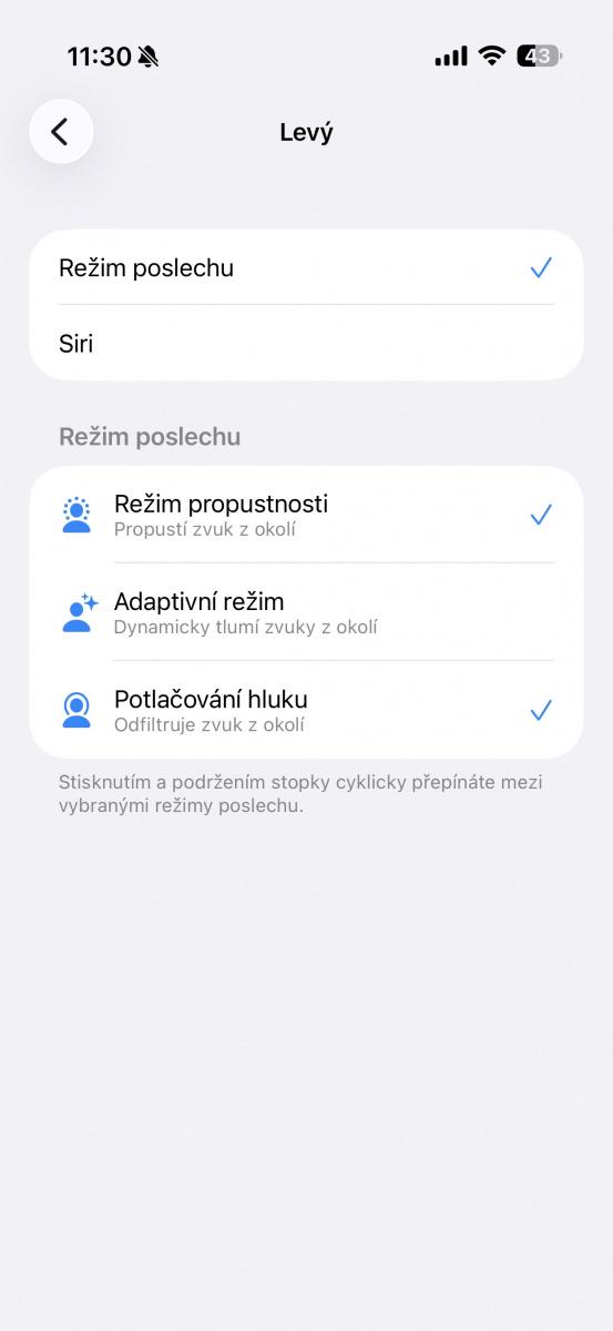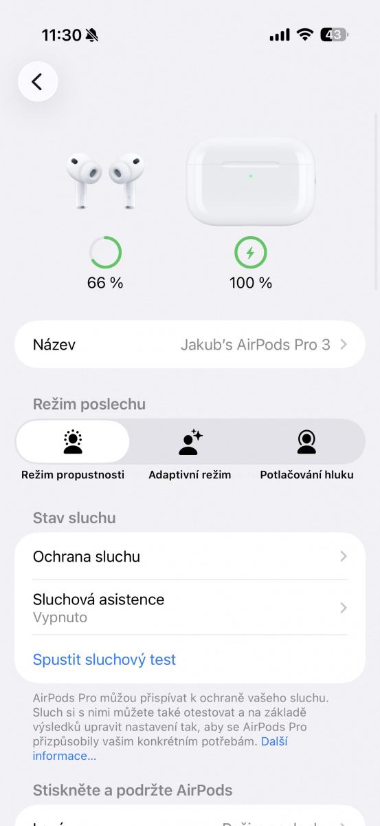 Nicméně s výrazně lepším ANC jde ruku v ruce jeden, minimálně pro mě osobně, celkem nepříjemný vedlejší efekt. AirPods Pro byla vždy sluchátka s výjimečně dobrým transparentním režimem propustnosti, kdy naopak sluchátka záměrně vpouští do vašich uší zvuky z okolí – abyste si mohli objednat v kavárně, nebo reagovat na dění na ulici bez nutnosti tahat špunty z ucha.