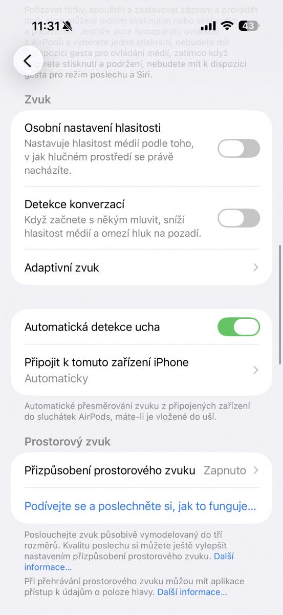 Pozitivní je i to, že při sledování filmů a seriálů se zvýšený důraz na basy projeví příjemně – dialogy zůstávají srozumitelné a akční scény působí hutněji. Ve spojení se funkcí personalizovaného prostorového zvuku (Personalized Spatial Sound) pak AirPods Pro 3 nabízejí působivý prostorový efekt, že se zvuk skutečně šíří kolem posluchače.