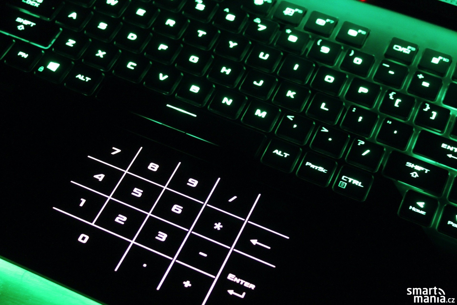 Je očividné, že klávesnice je určená hlavně pro herní účely, nicméně to neznamená, že se na ní nedá psát. Píše se na ní velmi příjemně. Dokonce bych se nebál tvrdit, že klávesnice je příjemnější než ta na MacBooku Pro. Není problém psát delší texty, zkrátka skvělý univerzál. Nedovolím si odhadovat životnost, to ukáže jen čas. Co mne však překvapilo, je chybějící numerická klávesnice, jsem u 15“ notebooků zvyklý na její přítomnost. Toto je po dlouhé době, kdy se mi nějaký takový dostal do rukou, předtím to byl MacBook Pro 15 2012 a to už je nějaký ten pátek.