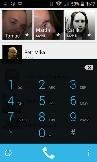 Stejně jako na většině Android zařízení máte práci s kontakty rozdělené na dvě části. Aplikace Lidé umožňuje práci s kontakty nejenom na úrovni jednotlivých kontaktů, ale také pracuje se skupinami a oblíbenými kontakty. Mezi těmito třemi pohledy se přesouváte horizontálním tahem prstem po displeji. Velkou výhodou všech Android zařízení je kompletní synchronizace s cloudem v rámci Google účtu. Kontakty tak můžete kompletně spravovat z počítače, stačí se přihlásit do Gmailu.