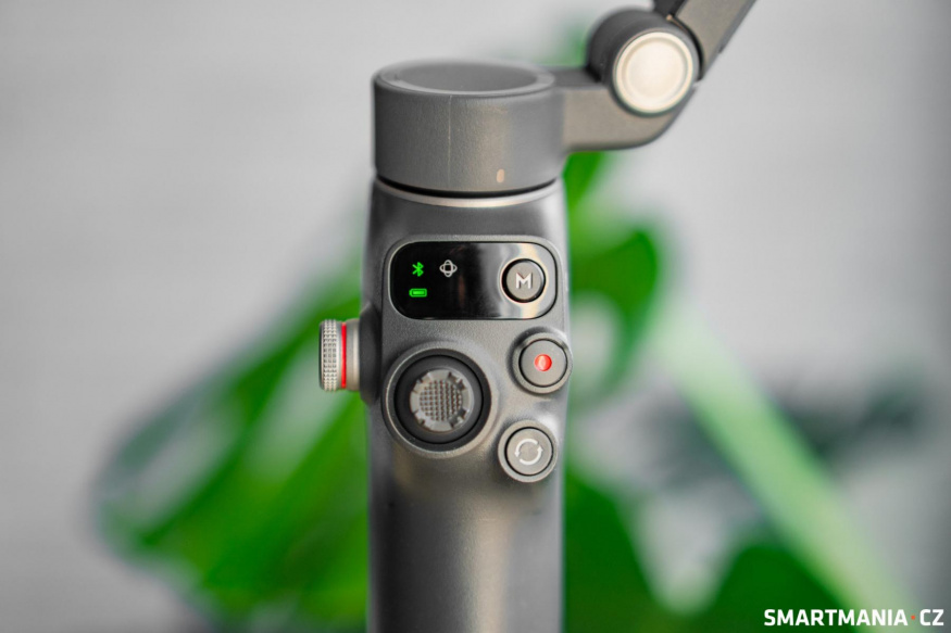 Rád bych zde také shrnul funkce jednotlivých tlačítek. Tím nejdůležitějším je tlačítko M. Jeho zmáčknutím se gimbal ihned zapne, delším přidržením ho vypnete. Jedním klikem měníte režimy sledování vaší ruky, což pěkně vidíte na malém barevném displeji. Zde nechybí ani indikace Bluetooth a stavu baterie.