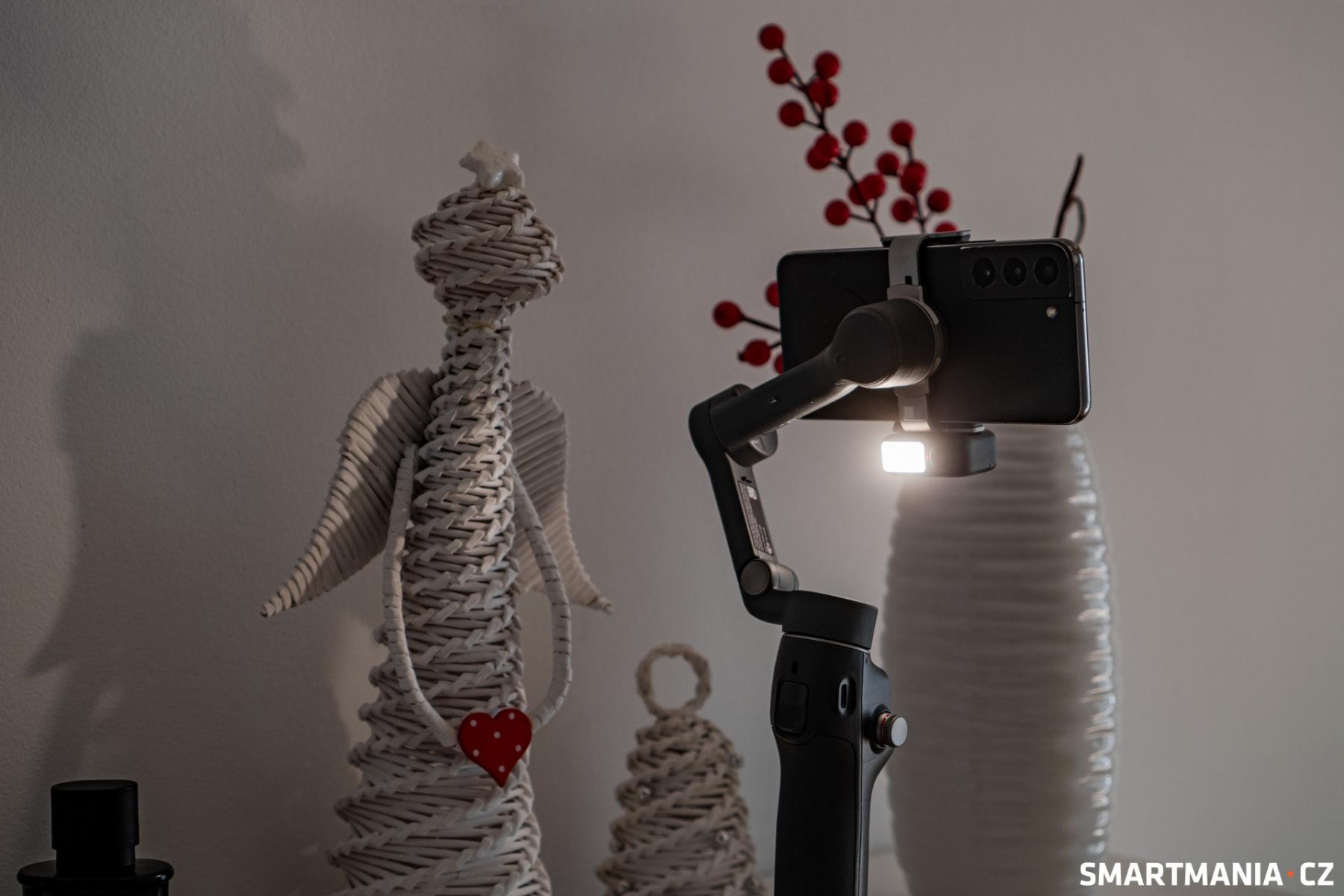 Vše opět ovládáte známými gesty. Vše většinou funguje dost dobře. Tohle je pro mě osobně super věc, protože díky tomu nemusím ve většině případů používat DJI Mimo. Multifunkční modul má v sobě také integrované osvětlení. Tomu lze pomocí tlačítek na jeho těle nebo otočným kolečkem na gimbalu měnit intezitu jasu a teplotu barev. Pro oboje máte k dispozici 4 stupně. Musím říct, že svítí poměrně dost výrazně, takže pro natáčení reportáží nebo vlogů při nedostatečném světle úplně ideální.