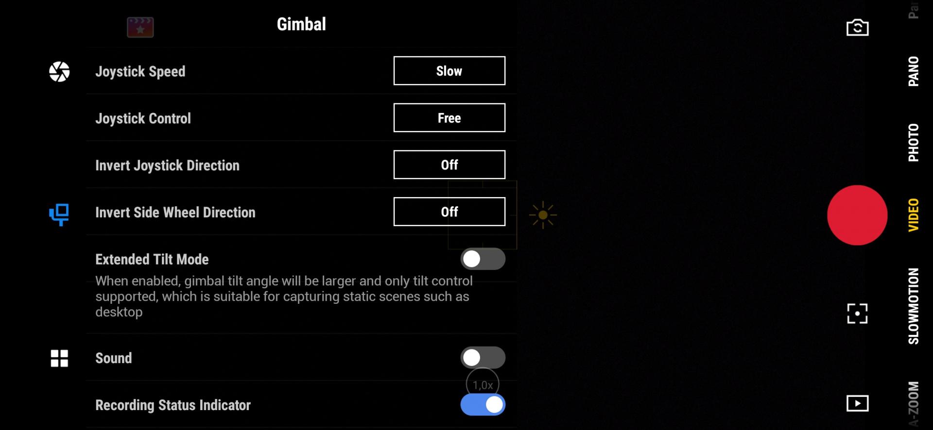 Možnosti nastavení jednotlivých režimů nejsou příliš rozsáhlé. Většinou lze pouze zapnout přisvětlovací diodu, upravit vyvážení bílé (s výběrem z přednastavených možností jako automatika, slunečno, zataženo, žárovka či zářivka) a zobrazit mřížku. Mnohem podrobnější je však nastavení samotného gimbalu, kde si lze například zvolit režim následování podle vlastních preferencí.