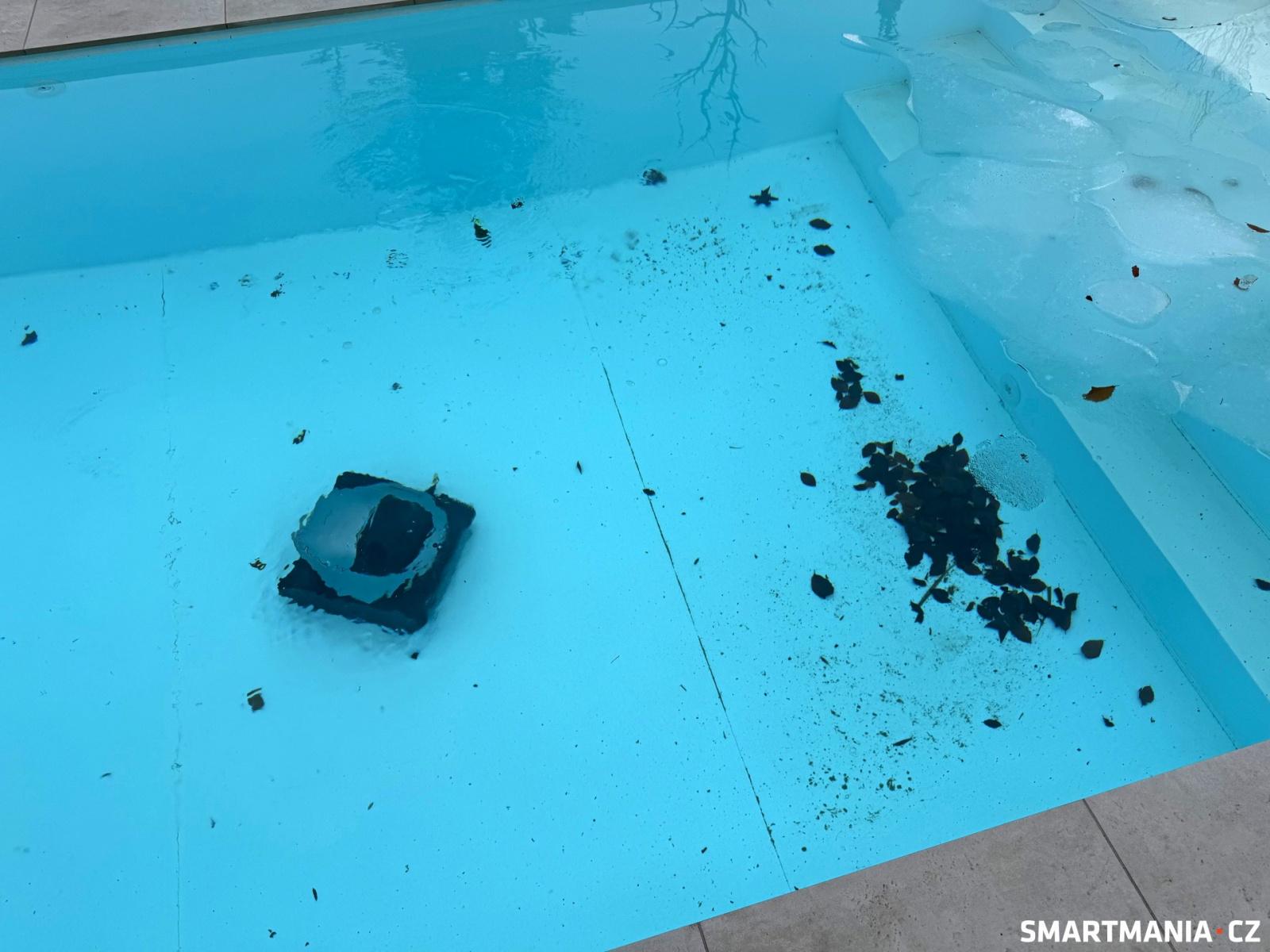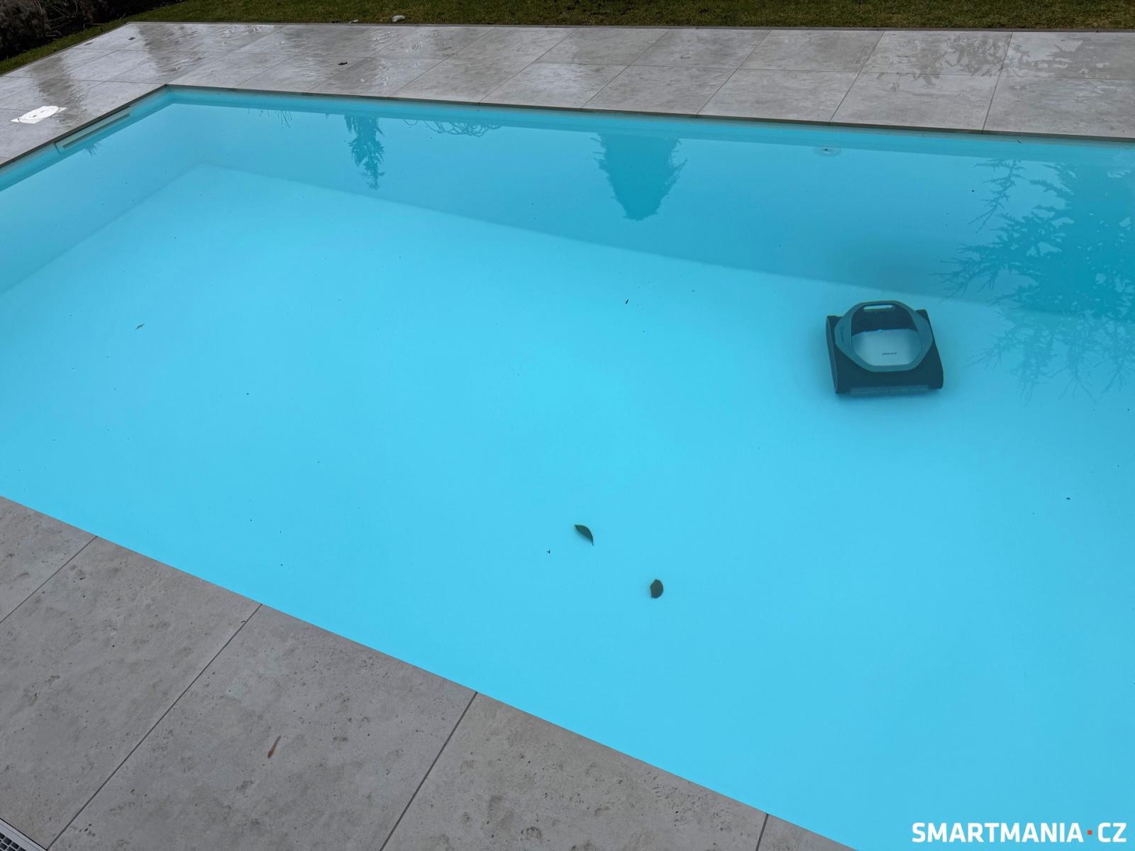 Po prvním komplexním úklidu na dně ještě zůstaly nějaké nečistoty, nicméně když jsem robota pustil podruhé, a tentokrát jsem v mobilní aplikaci nastavil vyšší sací výkon, výsledek byl skvělý. Tedy až na rohy bazénu, kde nečistoty zůstaly. Tímto neduhem z počátku trpěly i robotické vysavače pro domácnosti – kvůli své konstrukci se jednoduše nedokázaly dostat do rohů, proto u nich výrobci začali přidávat robotické rameno, které se v případě potřeby vysune. U bazénových vysavačů zatím nic takového nemáme. Možnosti, jak nečistotami zapomenutými v rozích bazénu zatočit, jsou dvě. Podrobněji se o nich rozepisuji v další kapitole.