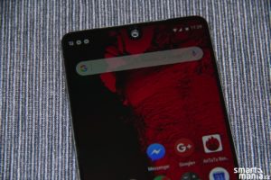 Drtivou většinu čelní strany (přibližně 85 %) zabírá displej. Rámečky kolem displeje jsou opravdu velmi tenké. Essential Phone v současnosti patří ke smartphonům s nejlepším poměrem velikosti displeje ku velikosti těla. Celý předek je krytý odolným sklem Gorilla Glass páté generace.