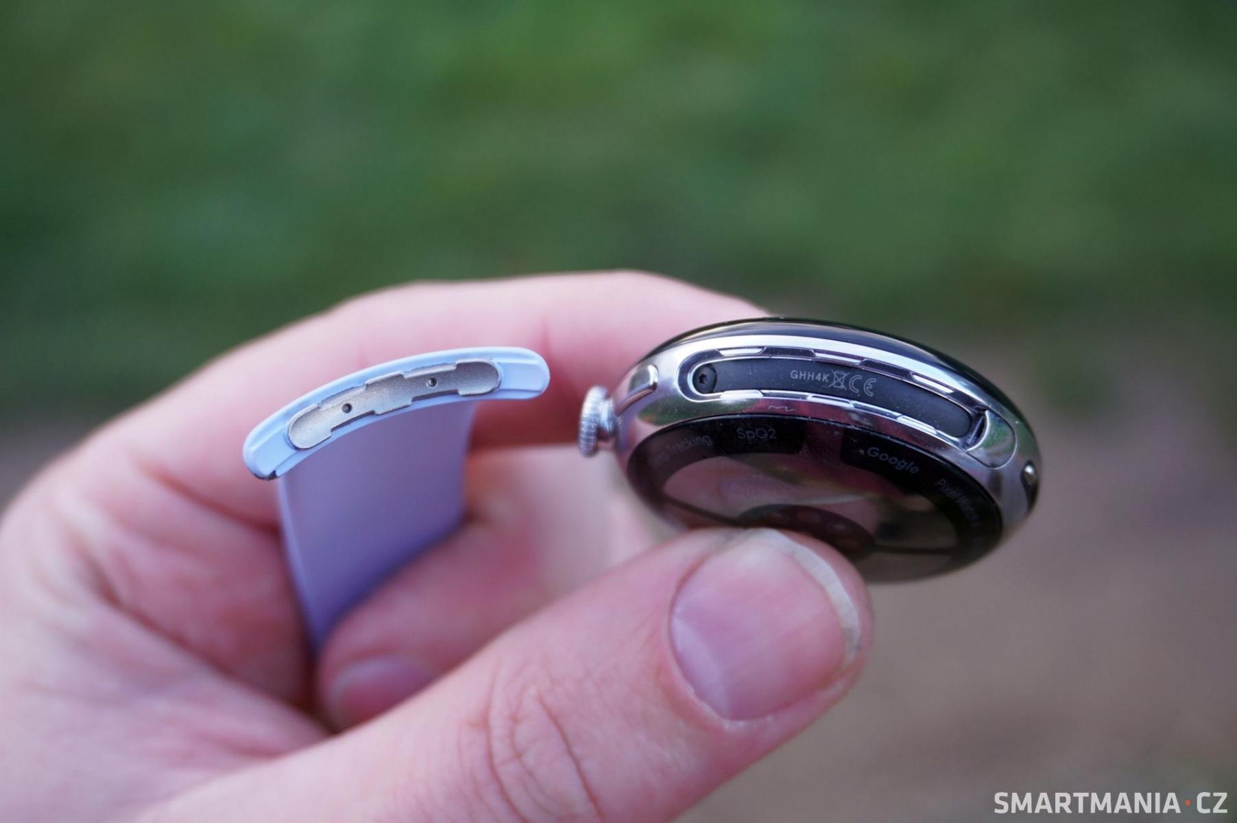 Právě tady je zakopaný pes. Přítomnost ještě neznamená dobré řešení. Kabel od nabíječky nejde odpojit, takže pokud ho zlomíte, musíte měnit celý stojánek. Bez něj si zase hodinky nenabijete, protože si doplňují energii magnetickým konektorem, bezdrátově to nejde. Řemínek zase ignoruje dekády používané rychloupínací stěžejky, aby je nahradil za jakousi rotační kolejnici. A zapínání? To je zase speciální v tom, že si pásek musíte na ruku dávat povolený, protože volný konec se zasunuje dovnitř.
