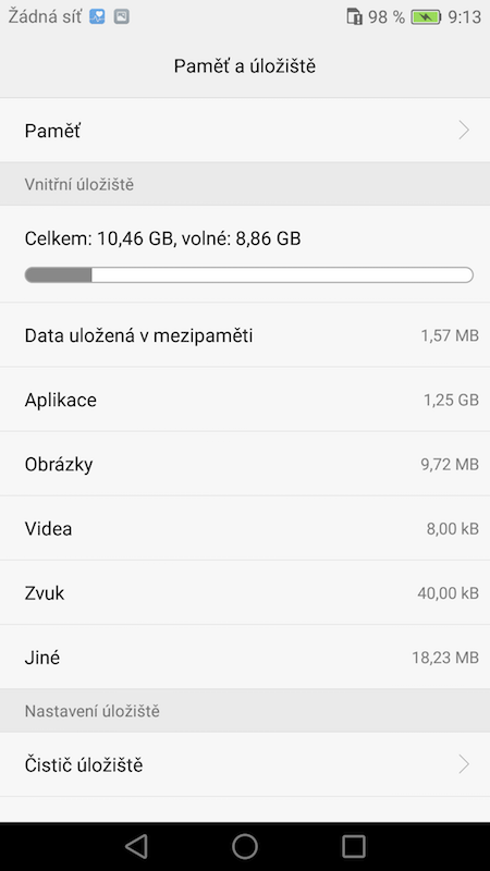 Pro uživatelská data je připraveno 16GB úložiště, z něhož je k dispozici necelých 8GB. To je důsledek několika předinstalovaných her od Gameloftu, jejich odinstalací však nějaké místo můžete uvolnit hned po prvním spuštění. Nechybí možnost paměť rozšířit až o 128 GB prostřednictvím paměťových karet, ovšem pouze tehdy, když používáte jen jednu SIM. Kvůli hybridnímu slotu totiž používání druhé SIM znamená nemožnost paměťovou kartu vložit.