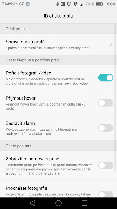 Dalším výrazným prvkem je kruhová čtečka otisků prstů. Její rychlost je opravdu výborná a Huawei Nova se v tomto ohledu řadí mezi špičku na trhu. Výrobce navíc doplnil čtečku o gesta. Přejetím prstu po čtečce si tak můžete například otevřít notifikační lištu, nebo listovat mezi fotografiemi v galerii.
