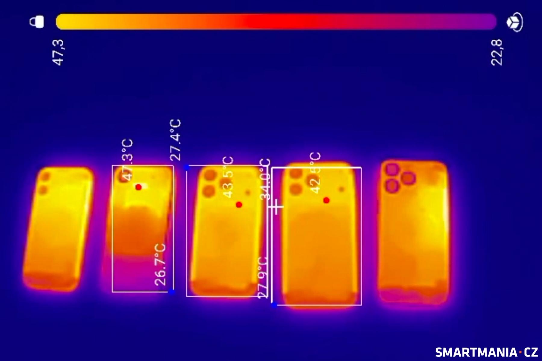 Jenže! iPhone Air absolutně nemá tolik výkonu, jako byste od čipové sady A19 Pro očekávali. Podle našeho měření má minimálně grafický výkon na úrovni iPhonu 16 (základního), výpočetní výkon dle CPU je jen o chloupek vyšší, zhruba na úrovni loňského iPhonu 16 Pro Max. Bližší srovnání si můžete prohlédnout v tabulce. Při zátěži se navíc enormně zahřívá – během stress testu 3DMark Wild Life Extreme vyrostla teplota až na 49 °C, u loňského iPhonu 16 Pro Max je to maximálně 46 °C, nejnovější iPhone 17 Pro Max s parní komorou se zahřeje přinejhorším na 42 °C.