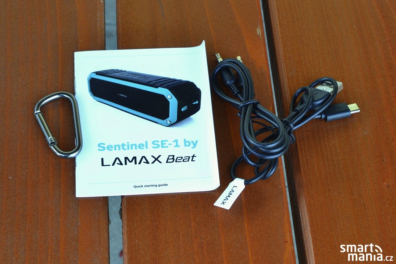 K modelu Sentinel SE-1 dostanete navíc ještě karabinu, díky které můžete reproduktor připnout například na batoh. Je trochu škoda, že součástí balení není také napájecí adaptér, ale díky přítomnosti univerzálních konektorů microUSB můžete využít adaptéry určené pro smartphony.