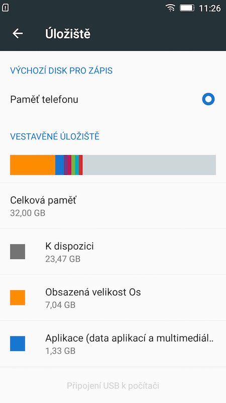 Z vnitřního 32GB úložiště zůstalo při prvním spuštění volno jen lehce přes 23 GB. Naštěstí si můžete vypomoci paměťovou kartou micro SD, kterou paměť jednoduše rozšíříte.