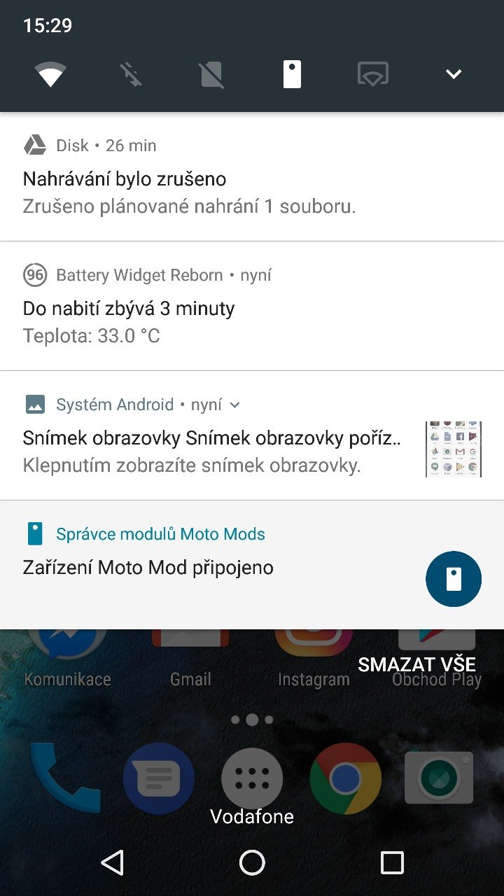 Lenovo dokázalo do své vlajkové lodě napěchovat baterii s kapacitou 2 600 mAh, což je menší číslo, než můžete spatřit u konkurence, ale vzhledem k tloušťce zařízení se jedná o dostatečnou hodnotu. I přes menší kapacitu mě baterie nijak neomezovala. Při intenzivním používání Moto Z jeden den vydrží a určitě vás nenechá na holičkách – neomezoval jsem se naprosto ničím a měl neustále zapnutá data, WiFi, Bluetooth a telefon používal běžným způsobem.