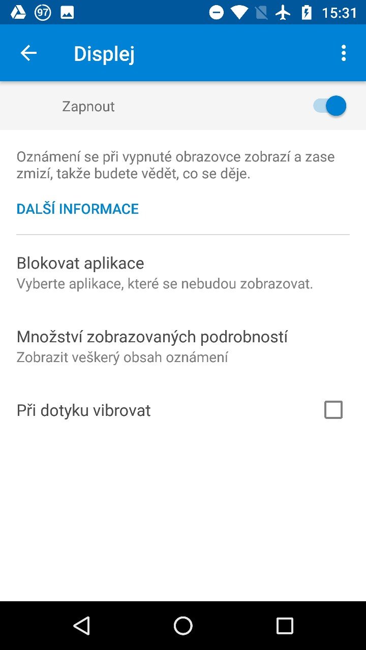 Pozorovací úhly jsou výborné, podání černé je excelentní a barvy jsou věrnější, než-li u vlajkových lodí společnosti Samsung. Díky použitému AMOLED panelu si navíc můžete nechat na displeji zobrazovat aktuální čas a informace o notifikacích. Stačí si funkci zapnout a pouhým mávnutím ruky nad telefonem se vám zobrazí důležité informace (senzor je umístěn vpravo dole pod displejem).