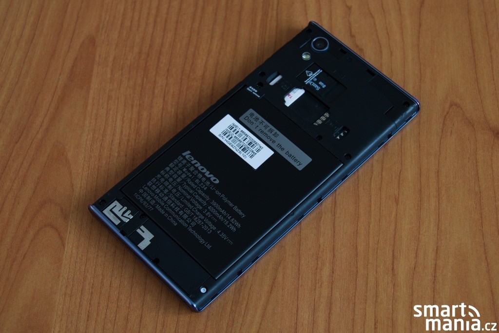 Pod zadním odnímatelným krytem se schovávají dva sloty pro karty formátu micro SIM a také zdířka pro paměťovou kartu micro SD. Nejvíce prostoru pod krytem ovšem zabírá baterie, která by měla jít snadno vyjmout. Výrobce se tomu ovšem brání a proto je na ní nalepena pečeť, s varovným nápisem proti jejímu vyjmutí.