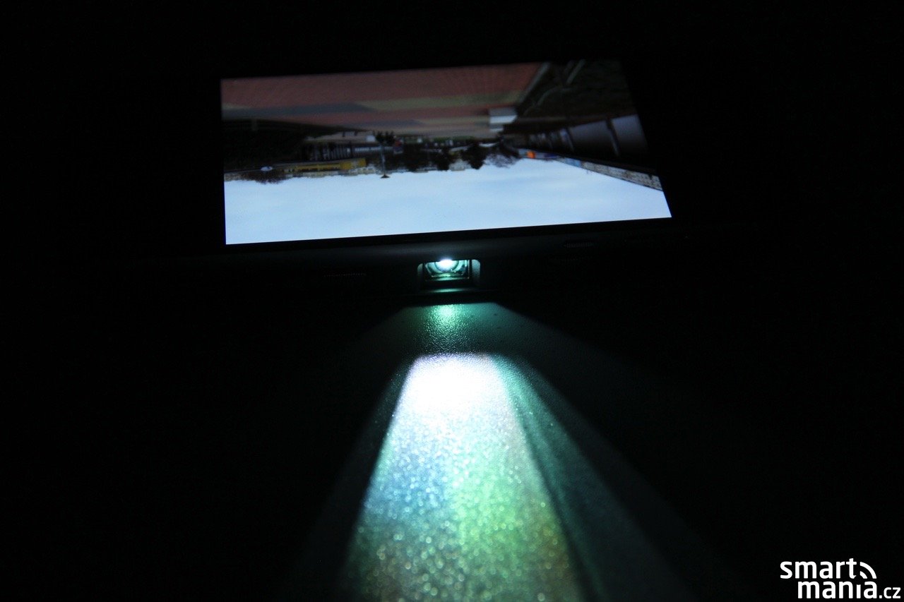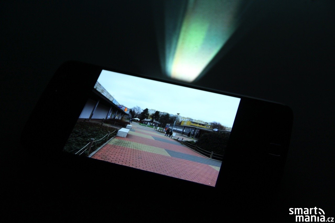 Ačkoliv má telefon Moto Z Quad HD rozlišení, výsledný obraz z projektoru činí jen 854 x 480 pixelů, což není moc, ale na video, grafy či tabulky to bohatě stačí. S textem je to o něco horší a na zobrazení dokumentů by si projektor zasloužil rozlišení o něco vyšší. Jas projekční lampy má 50 lumenů (kontrast je 400:1), jehož intenzitu lze stiskem tlačítka pro zapnutí/vypnutí modulu měnit. Opět bych čekal o něco výkonnější lampu, ale pokud se nacházíte v dostatečně temné místnosti, s projekcí není žádný problém. Životnost lampy je podle výrobce až 10 tisíc hodin.
