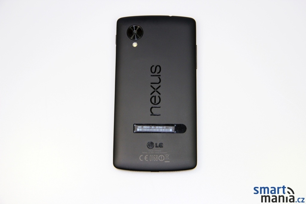 Zádům telefonu dominuje vytlačené a poměrně velké logo řady Nexus, pod ním je drobnější logo výrobce LG. V levém horním rohu je umístěna čočka fotoaparátu spolu s přisvětlovací LED diodou. Během testování jsme se setkali s několika kusy, u kterých při zatřepání „cosi“ chrastilo v oblasti čočky, není se ale třeba ničeho obávat – je to zcela normálu (vlastnost z výroby) a takto chrastí právě optika fotoaparátu.