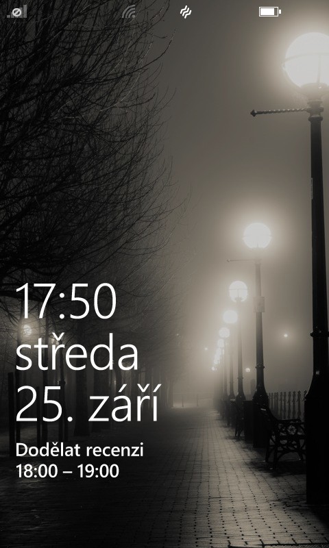 Zamykací obrazovka nabídne informace o datu a času a případně také o zmeškaných událostech. Na uzamčené obrazovce můžete nechat zobrazovat také informace aplikací třetích stran (počasí, RSS zprávy, nadcházející události z kalendáře, Facebook alba…), což je jedna z příjemných novinek systému Windows Phone 8.