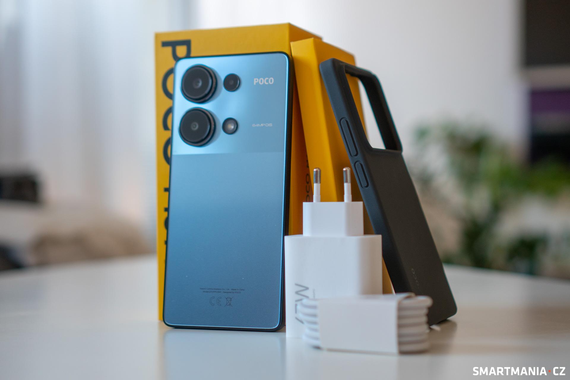 Telefon dorazil v jasně žluté krabičce, která ukrývala větší 67W nabíjecí adaptér s USB-A konektorem a také odpovídající kabel (USB-A na USB-C). Příjemným překvapením v balení je matný šedý silikonový kryt a nechyběl samozřejmě ani papírový manuál a telefon samotný.