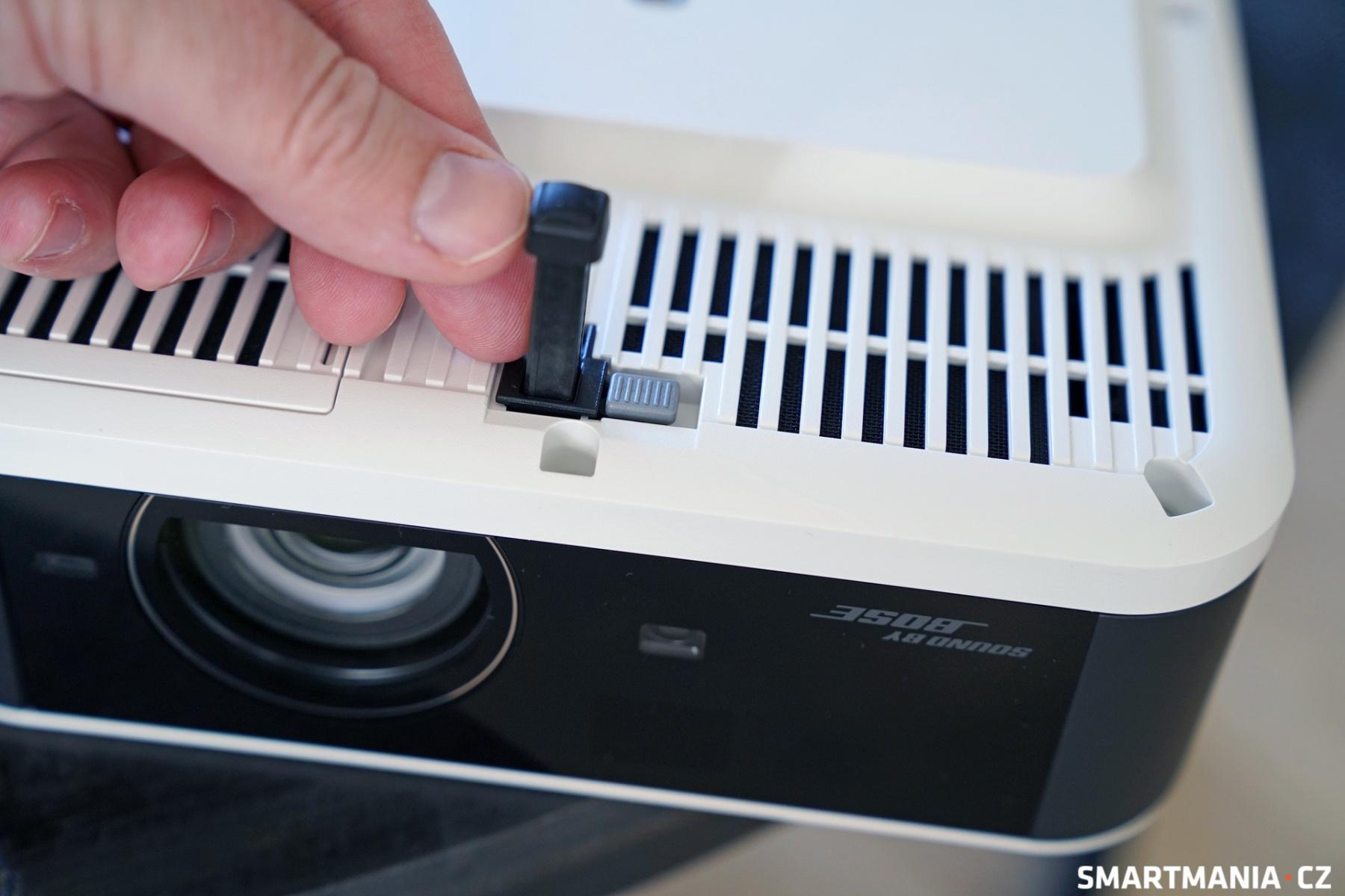 Boky i zadní části konstrukce jsou perforované, protože projektor samozřejmě disponuje aktivním chlazením, které přes perforaci vyhání přebytečné teplo ven. Ve spodní části projektoru, uprostřed a vpředu, kde je umístěn objektiv, se nachází vysouvací nožka, pomocí které regulujete sklon. Při plném vysunutí zvednete přední část projektoru přibližně o 4 centimetry.