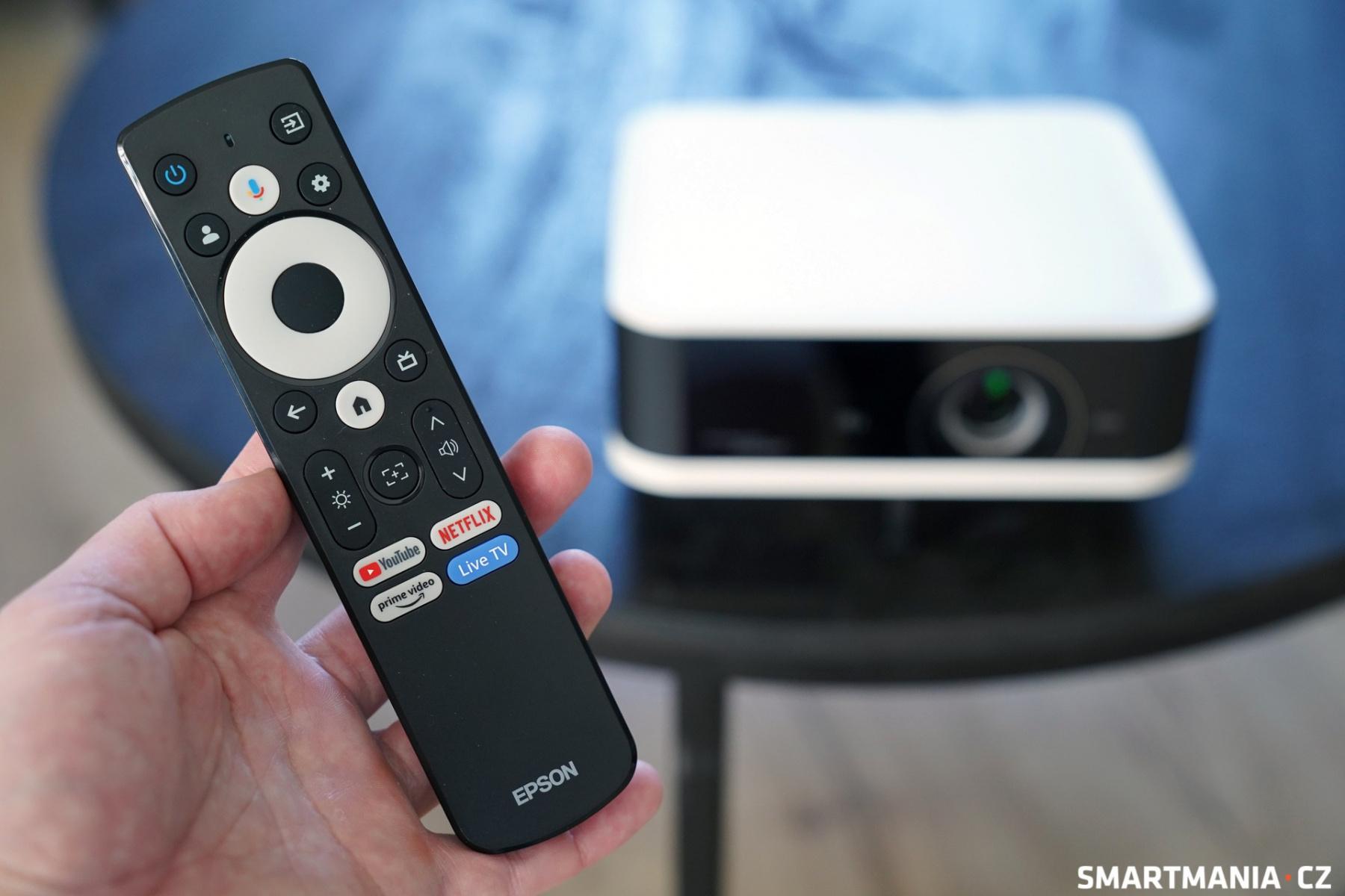 Najdeme na něm všechny nezbytné ovládací prvky a můžete přes něj projektor zapnout i vypnout. Tlačítko Power samozřejmě nechybí ani na samotném projektoru. Dále zde najdete tlačítka pro rychlý přístup k oblíbeným službám (YouTube, Netflix, Amazon Prime), samozřejmě regulátor hlasitosti a potěší přítomnost dedikovaného tlačítka pro regulaci jasu.