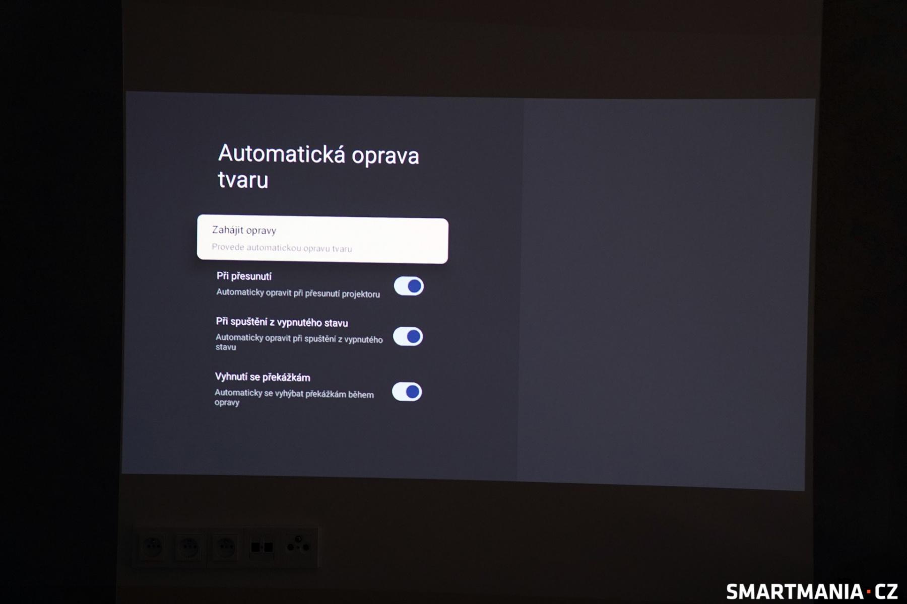 Někdy se stalo, že se při manipulaci s projektorem, třeba při mírném posunutí, obraz lehce rozhodil a nepřizpůsobil se zcela ideálně ploše, ale v tomto případě s ním stačilo jen opětovně maličko pohnout, aby automatika opět zareagovala a obraz srovnala. Případně se nabízí možnost zamířit do nastavení, kde lze skrze nabídku Lichoběžník spustit automatickou opravu.