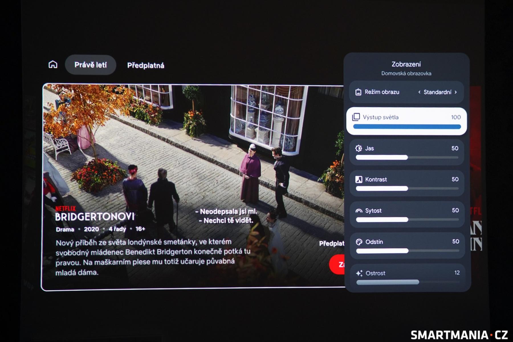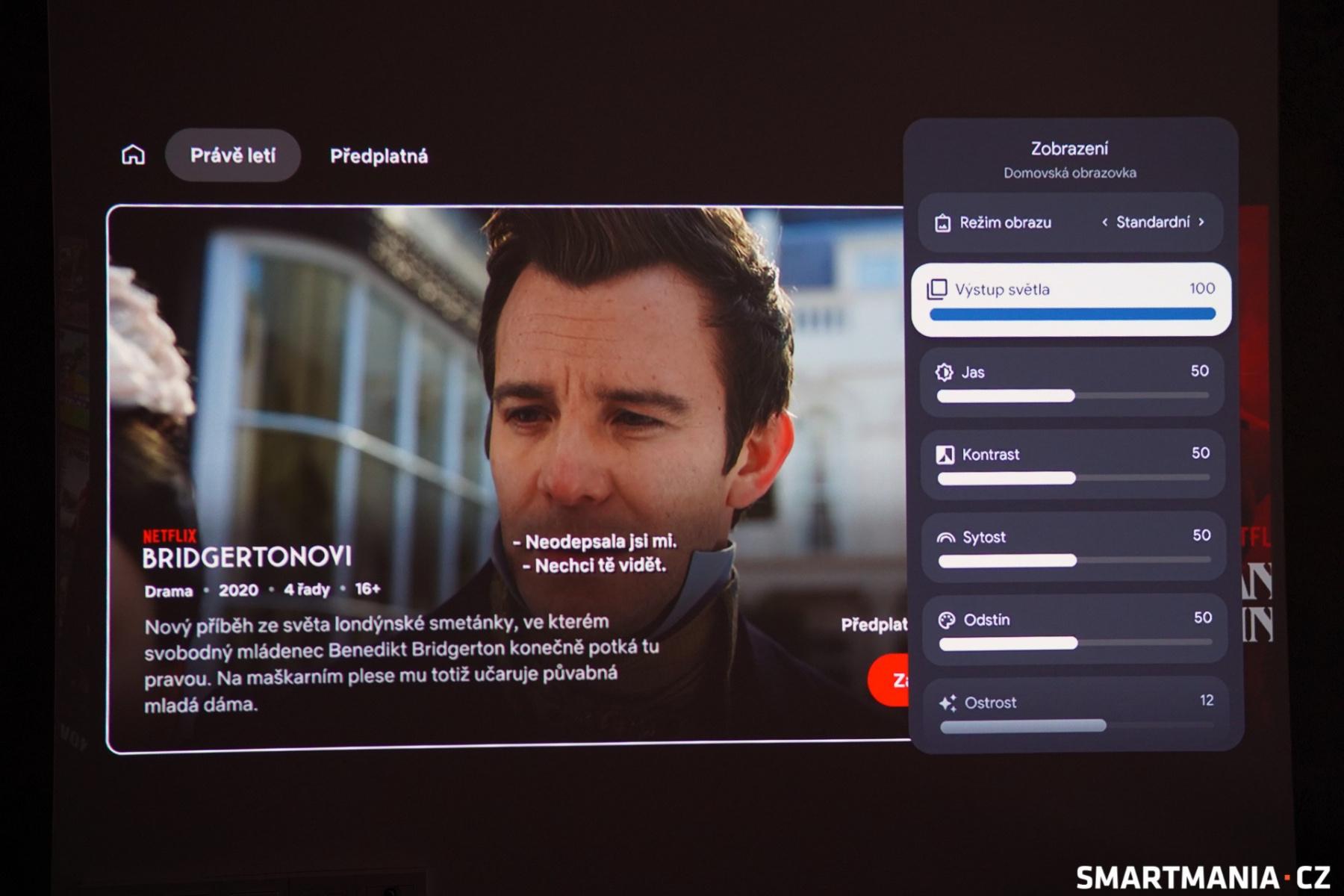 Velkou pochvalu si zaslouží zcela rovnoměrné podsvícení, a to i v rozích obrazu, v nichž není patrné ani rozostření nebo jiné neduhy, které se u domácích projektorů někdy vyskytují. Jak jsem již zmínil, přímo přes ovladač je možné manuálně upravovat výstup projektoru, konkrétně mezi 50 a 100 %. Dále je k dispozici ruční korekce jasu, kontrastu, sytosti barev, odstínu a ostrosti.