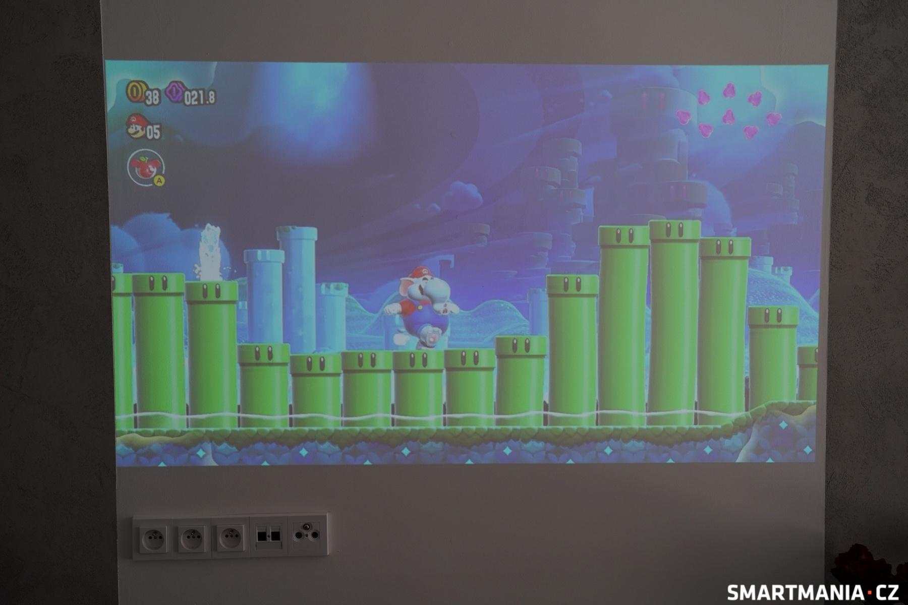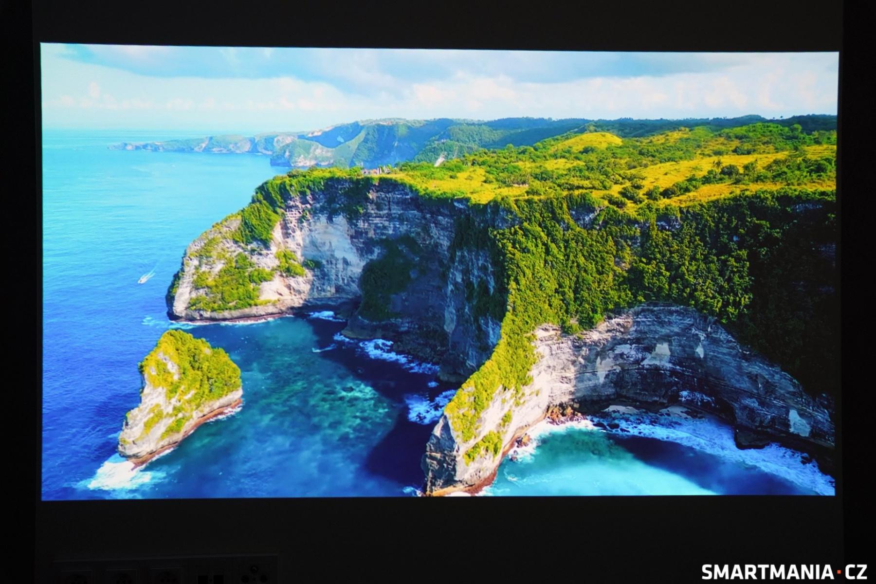 Za zmínku určitě stojí i funkce Korekce barvy stěny, díky které můžete projektor použít prakticky na jakkoliv barevné stěně, a vždy se dočkáte stejného výsledku. Kromě klasiky v podobě bílé jsem ho vyzkoušel i na světle šedé a světle hnědé. Výsledek? Obraz byl v obou případech výborný a prakticky stejně kvalitní a kontrastní jako na bílém podkladu.