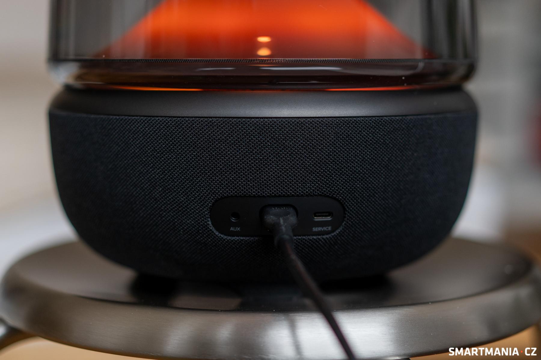 Na zadní straně najdeme napájecí konektor, audio jack pro přehrávání hudby prostřednictvím kabelu a také USB-C, které v tomto případě slouží pouze jako servisní (hudbu lze přes USB-C přehrávat pouze u verze pro USA). Součástí balení je kromě reproduktoru pouze napájecí kabel a papírové manuály. Nic víc ani nepotřebujete.