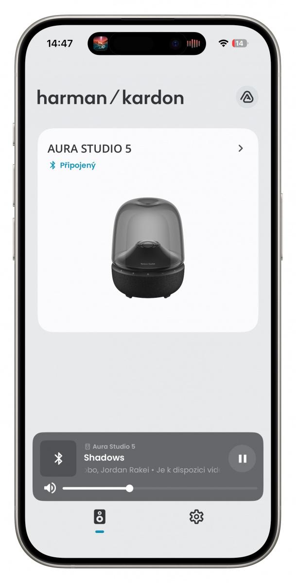 Aura Studio je všesměrový reproduktor, čemuž odpovídá i jeho tvar zaobleného kužele. Spodní část v černém provedení disponuje povrchovým opletením tkaninou, takže materiál je velmi příjemný na dotek a zároveň zde nehrozí ulpívání otisků prstů. V místě, kde spodní část přechází do skleněné horní poloviny, najdeme také pruh s dotykovými tlačítky. Konkrétně se jedná o tlačítka pro Bluetooth párování, aktivace světelné projekce, nastavení světelného režimu a snížení a zvýšení hlasitosti. Veškeré další ovládací prvky je potřeba hledat v doprovodné aplikaci Harman Kardon One.