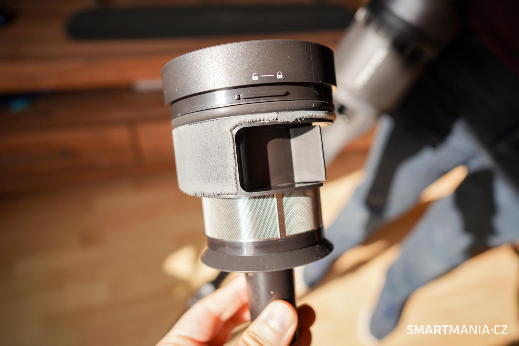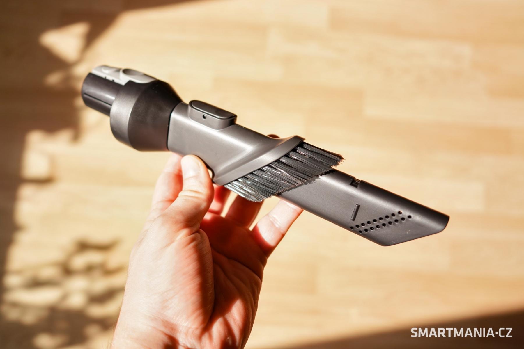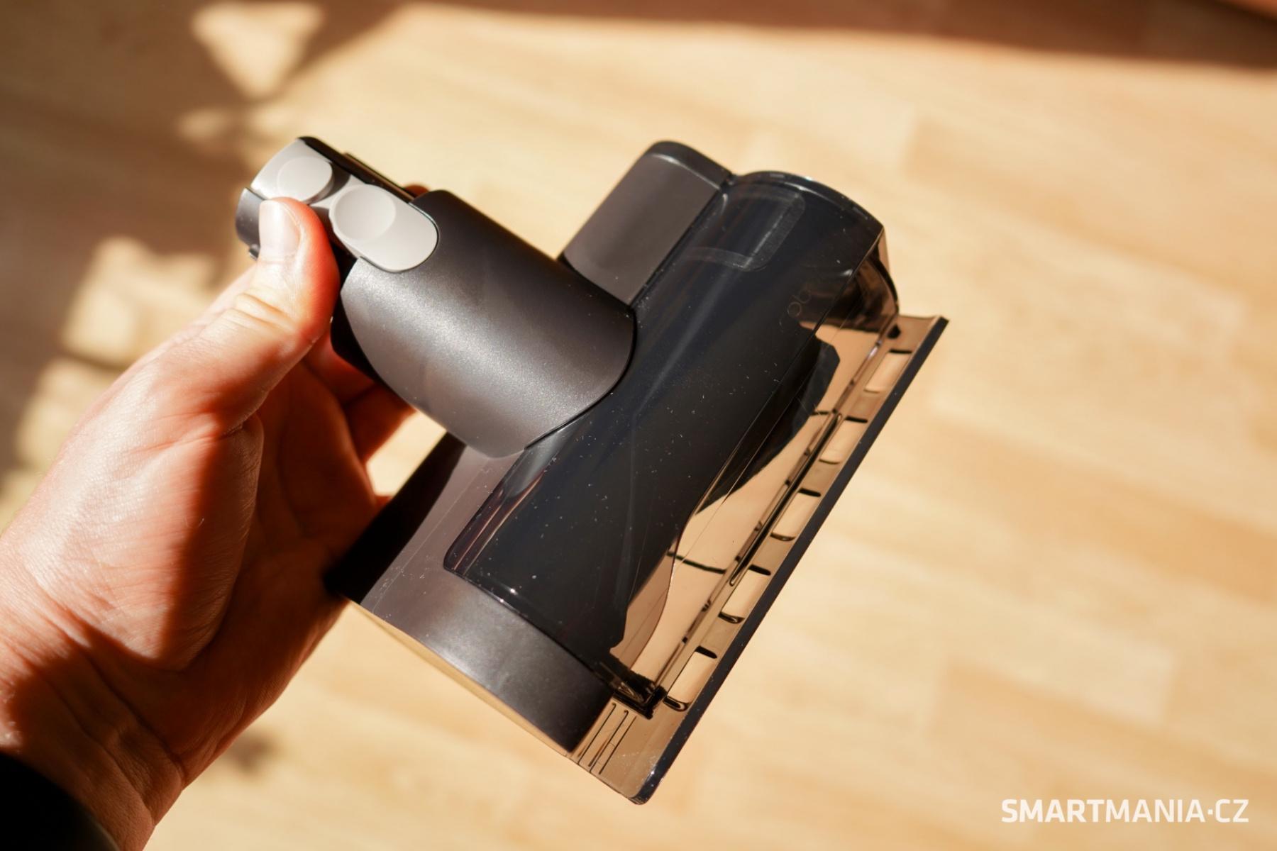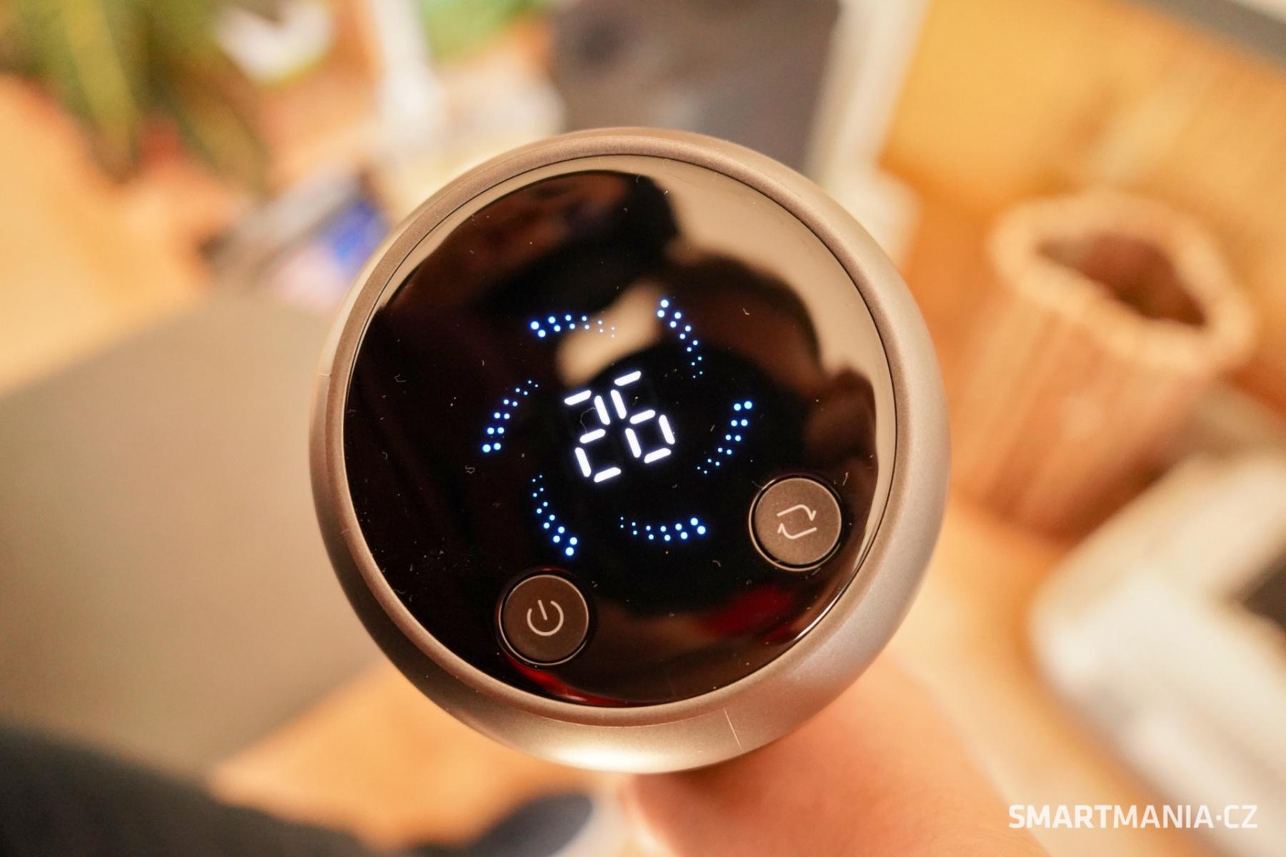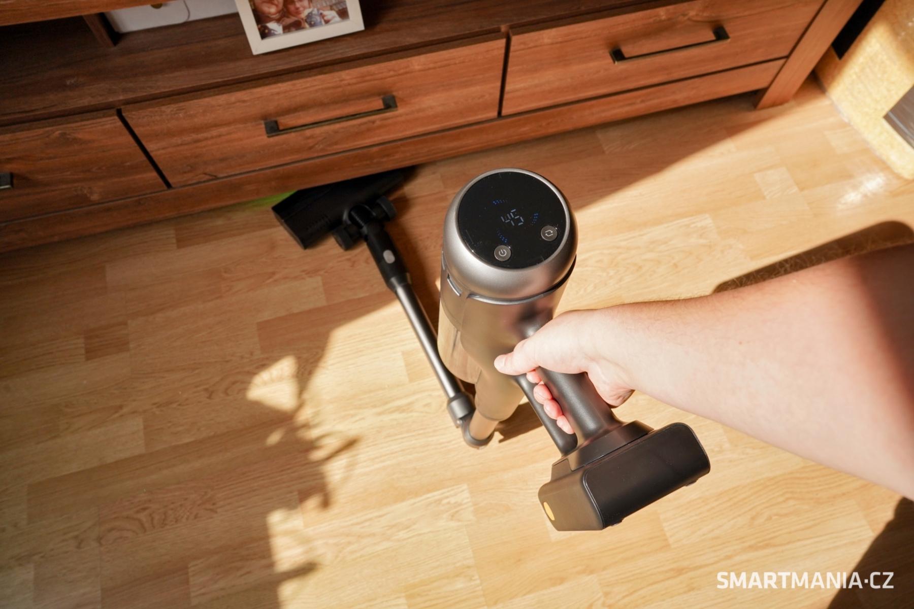 Ovládání je až triviálně jednoduché – na horní straně se nachází LED displej a dvě tlačítka. Zatímco to první zapíná/vypíná vysavač, to druhé vám umožní přepínat mezi třemi stupni intenzity vysávání. Displej poté intenzitu ukazuje s pomocí „lopatek“, takže ihned víte, jak silně vysavač pracuje. Kromě toho displej také ukazuje, kolik procent baterie vám při dané intenzitě zbývá, abyste věděli, zda si máte s úklidem pospíšit a zda bude potřeba po dokončení vysávání vysavač dobít.