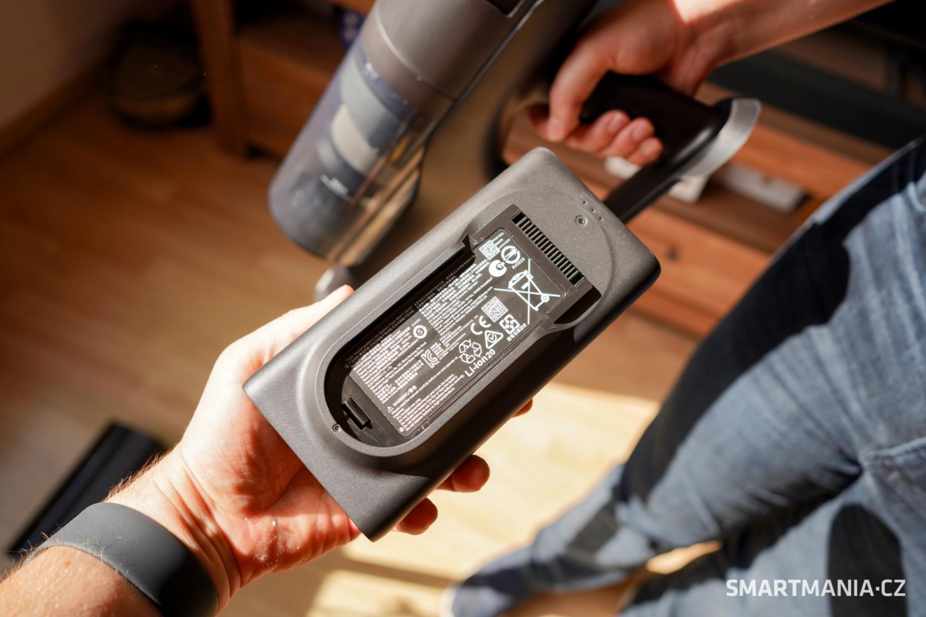 Vyměnitelná Li-Ion baterie má kapacitu 2964 mAh, což si přiznejme, že není mnoho. Na jedno nabití se můžete dostat na maximální délku vysávání atakující hodinu a půl, což sice zní dobře, nicméně pokud budete vysávat na vyšší intenzitu a máte velkou domácnost, počítejte s řádově nižšími hodnotami. Pokud baterii vyždímáte až na nulu a potřebujete co nejdříve pokračovat v úklidu, nějakou chvíli si počkáte – do plné kapacity se totiž baterie dobije za přibližně tři a půl hodiny.