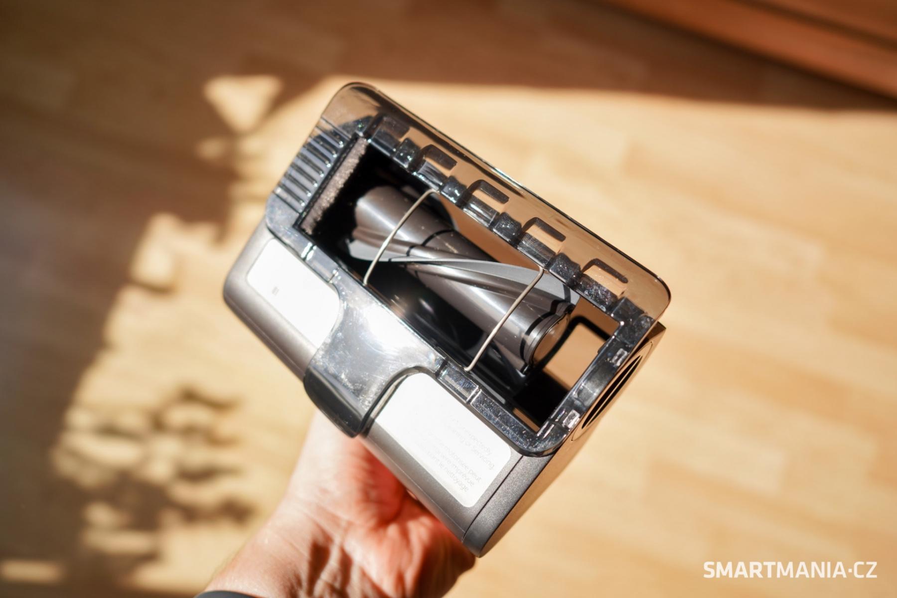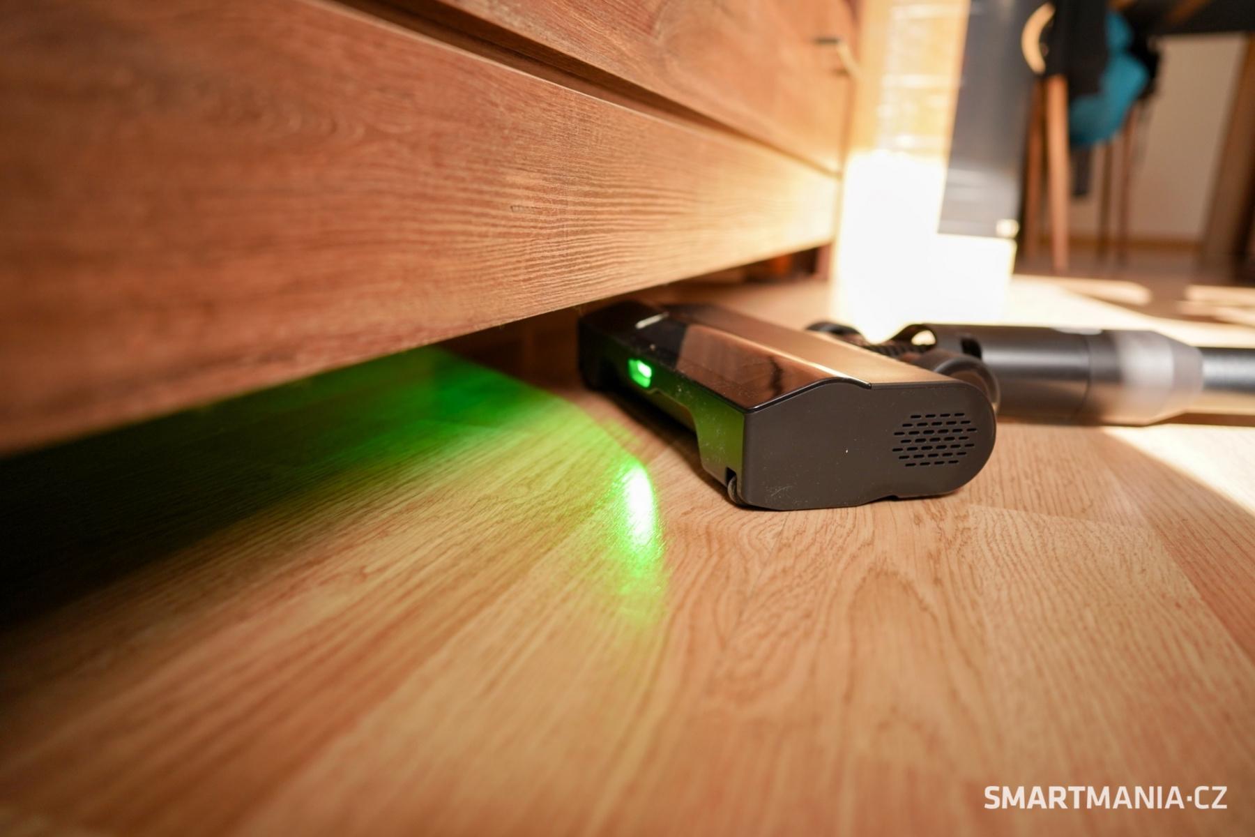 Ocenit musím také šikovné zelené LED světlo, které vám v úhlu 140° jasně a bez příkras ukáže, jak moc je potřeba v daném místě vysávat a zda nebude lepší konkrétní místo raději přejet ještě jednou. Nejedná se o unikum vysavačů od Roborocku, přesto je potěšující, že se z této drobné, ale velmi užitečné vychytávky pomalu stává standard. Ani ohebný kloub a nízký profil vysavače (konkrétně jen 5,6 centimetrů) není k zahození, obzvláště pokud máte mezery mezi podlahou a nábytkem, kam se například nedostane robotický vysavač.