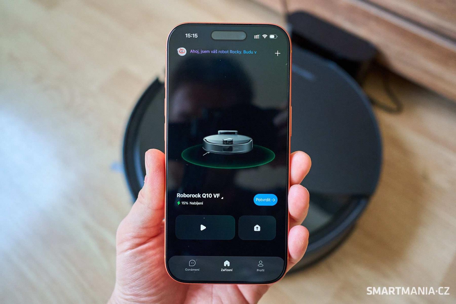 Mobilní aplikace Roborock je na rozdíl od hlasových příkazů robota plně v češtině. Uvnitř ní toho s robotickým vysavačem příliš mnoho dělat nemůžete: primárně zde můžete spravovat zmapovanou domácnost (případně upravit jednotlivé místnosti) a zvolit, jakým způsobem bude vysavač provádět úklid. Pro každou místnost můžete nastavit vlastní úklid – kupříkladu lze v předsíni vysát jen lehce a mopovat, zatímco v obývacím pokoji můžete jen vysát na maximální výkon a nemopovat vůbec.