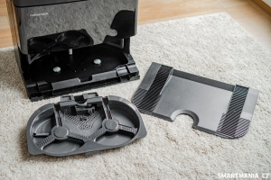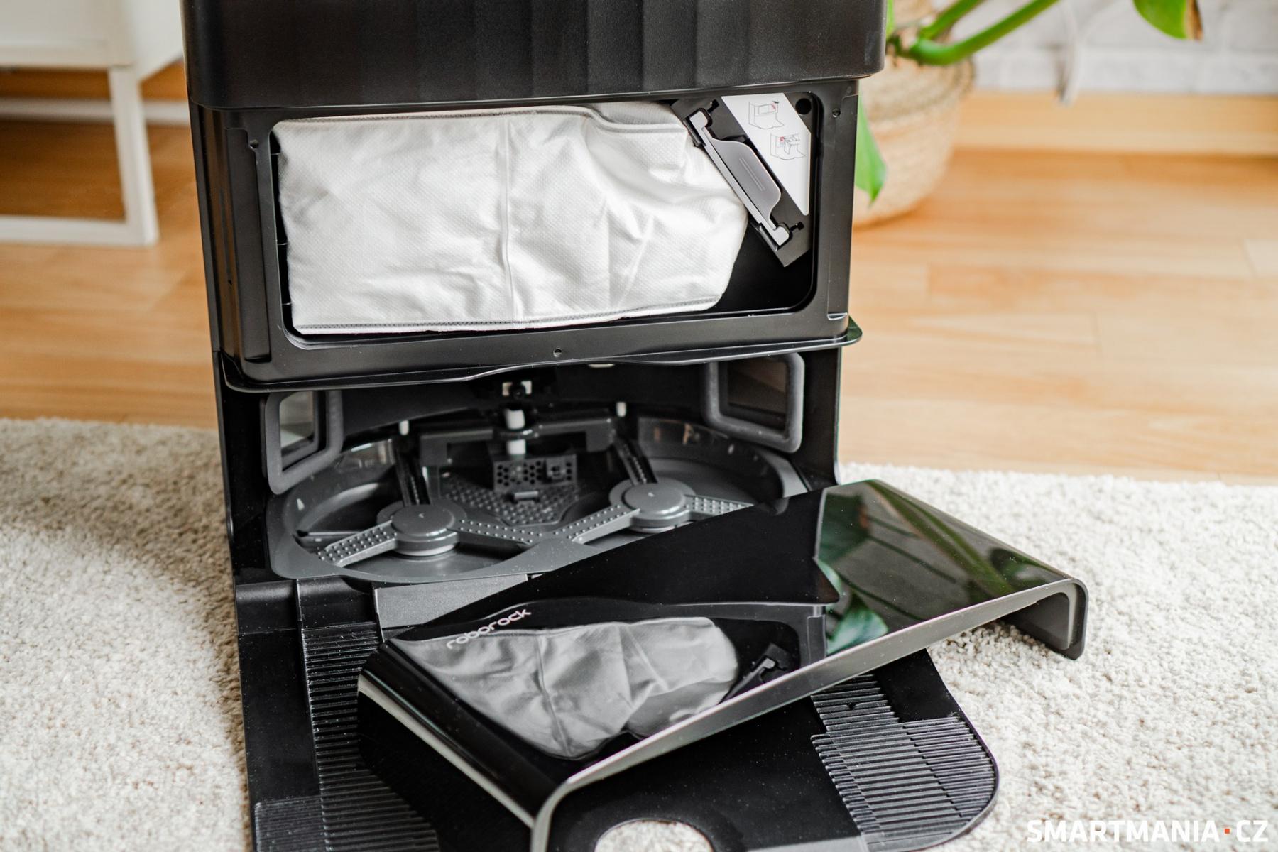 Jedním z hlavních prvků tohoto modelu je inteligentní dokovací stanice generace 3.0. Už na první pohled je zřejmé, že nejde o běžnou nabíjecí základnu – stanice totiž hraje klíčovou roli v celkovém provozu vysavače. Dokáže automaticky vyprázdnit nádobku na prach, umýt mopovací podložky horkou vodou o teplotě kolem 75 °C a následně je vysušit pomocí teplého vzduchu (45–55 °C). Designově se perfektně doplňuje s robotem. Oceňuji zejména převážně matné provedení, kde výjimku tvoří pouze sundavací lesklý kryt, pod kterým se ukrývá pytlík na prach (2,7 litru).