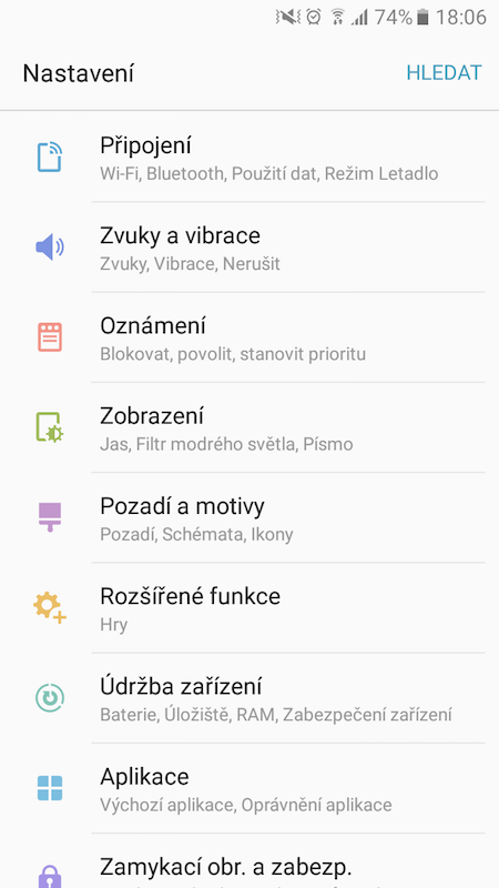 Velice rychle jsem si zvykl na funkci AlwaysON, která nahrazuje notifikační diodu – na displeji neustále svítí čas, datum, stav baterie a ikony aplikací, jež vás o něčem notifikují. Za noc byl úbytek baterie přibližně 10 %, o zásadního žrouta se tak nejedná. Samsung do systému implementoval i režim pro omezení modrého světla, který můžete aktivovat ručně nebo si nastavit automatickou aktivaci ve stanovený čas.