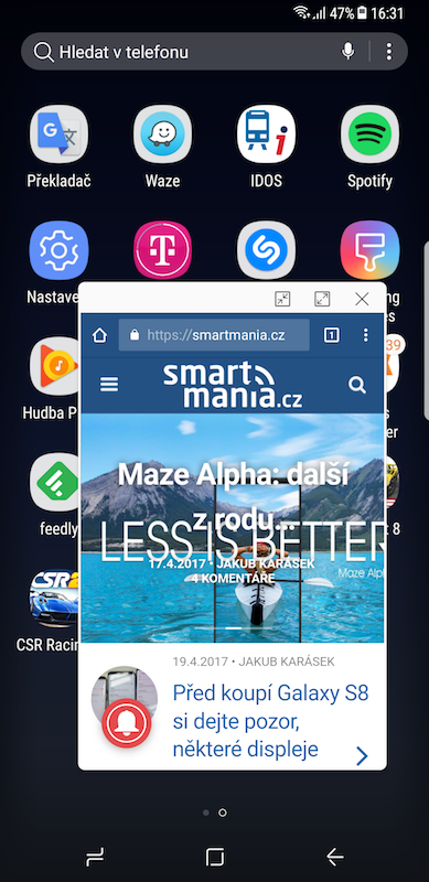 Stejně jako předchozí top modely, i Galaxy S8 podporuje režim multi-window, kdy můžete mít na displeji aktivní dvě aplikace současně. Provedete to poklepáním na ikonku z nabídky naposledy spuštěných aplikací, případně delším stiskem softwarové klávesy pro přepínání mezi aplikacemi.