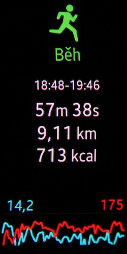 A jaké jsou výsledky? Jas náramku byl nastavený na 7. úroveň, GPS byla aktivní a do připojených Bluetooth sluchátek jsem po celou dobu streamoval hudbu. Po hodině běhání ukazatel baterie klesl o 27 % a naměřená vzdálenost byla 9,02 km. Endomondo na telefonu naměřilo vzdálenost 8,99 km, takže v tomto režimu Gear Fit měří opravdu velmi přesně.
