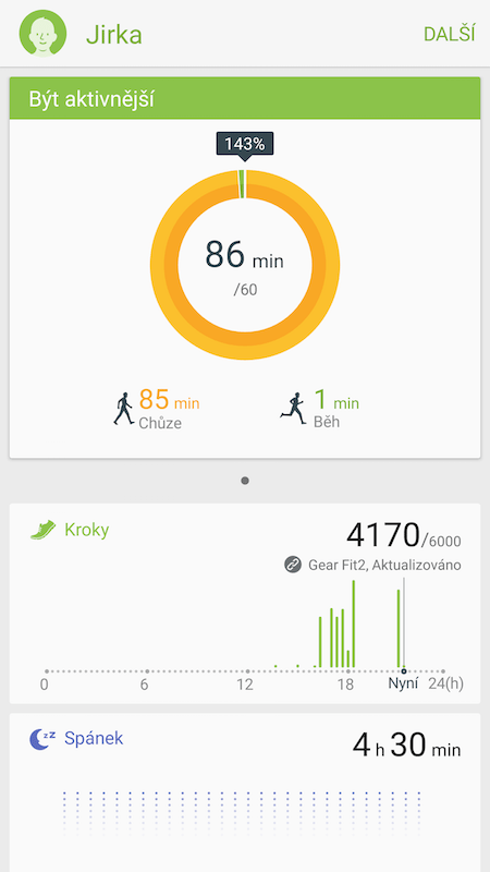 Nástroj S Health poskytuje velmi komplexní přehledy a statistiku vašeho pohybu a spánku. Je ale obrovská škoda, že s náramkem zatím nespolupracují další sportovní aplikace jako RunKeeper, Endomondo a další, chybí dokonce i podpora pro Google Fit. První generace Gear Fitu přitom podporu od vývojářů dostala, tak doufejme, že se v dohledné době dočkáme i u „dvojky“.