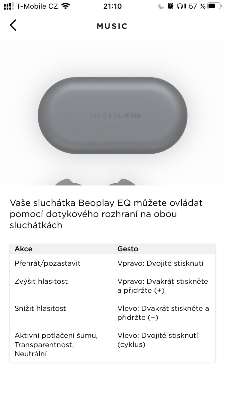 Po zvolení produktu Beoplay EQ v aplikaci se zobrazí základní informace v podobě úrovně nabití jednotlivých sluchátek i krabičky. Zároveň v aplikaci můžete ovládat přehrávání i volit hlasitost. Můžete také přepínat mezi předvolenými režimy poslechu nebo si ekvalizér „Beosonic“ upravit podle vlastních preferencí.
