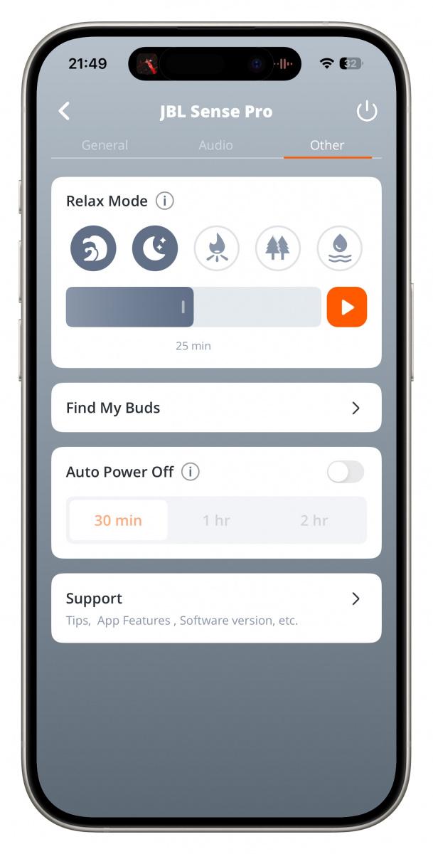 V záložce Audio je možné editovat ekvalizér, respektive zvolit jeden z presetů nebo si hrát přímo s deseti pásmy v grafickém zobrazení. Nechybí možnost vytvoření vlastního profilu, který je možné uložit. V sekci Spatial Sound najdete efekty pro přehrávání filmů, hudby i pro herní zážitek. Je zde řada dalších funkcí, jako je limiter hlasitosti, nebo nastavení zvuku telefonních hovorů. V poslední záložce Other vidíme dodatečné funkce v podobě relaxačních zvuků, funkce pro hledání sluchátek i časované vypnutí.