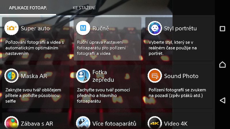 Aplikace fotoaparátu má stejnou podobu s jakou se můžete setkat u jiných smartphonů značky Sony. Při spuštění se automaticky aktivuje režim Super auto, který ovšem příliš nedoporučuji používat. Fotografie pořízené v tomto režimu nevyužijí plné rozlišení fotoaparátu a jejich kvalita není zrovna oslňující. Naštěstí si můžete přepnout do režimu nazvaného Ručně, který vám umožní dostat z fotoaparátu maximum.