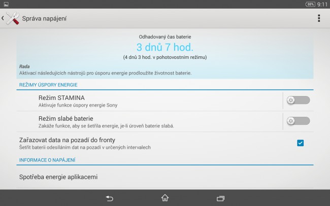Je ovšem potřeba myslet na to, že nabíjení tabletu zabere asi čtyři a půl hodiny. Pro úsporu energie je k dispozici také speciální STAMINA režim. Ten vypne data a deaktivuje aplikace na pozadí (můžete vybrat programy, pro které toto nebude platit) při zamčené obrazovce a omezí výkon procesoru na nutné minimum, díky čemuž se již tak obstojná výdrž ještě o kus prodlouží.