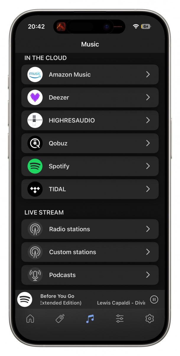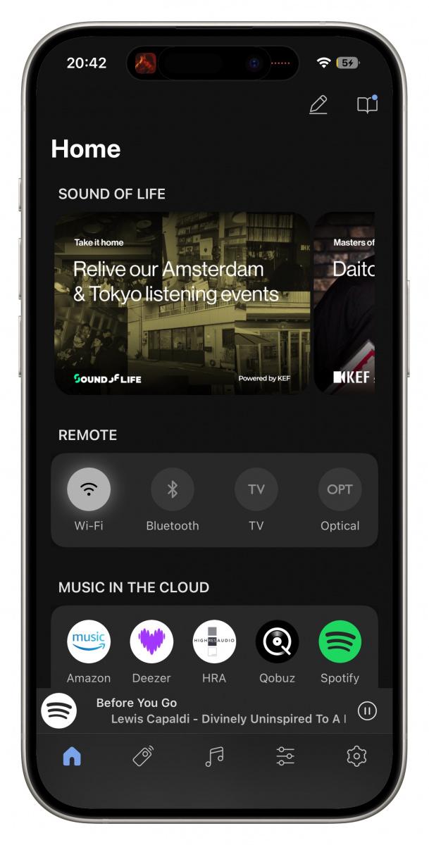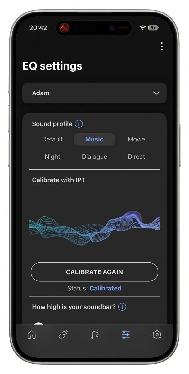 Aplikace KEF Connect má v případě soundbaru KEF XIO hned několik využití. Samozřejmě poslouží pro spárování a výběr zdroje zvuku, ať už používáte Bluetooth, Wi-Fi, televizi nebo optiku. Umožní také jednoduchý přístup do streamovacích služeb, jako je Amazon Music, Spotify, Deezer nebo Tidal. Už při prvním párování je ale vhodné zadat také parametry poslechové místnosti. Důležitá je výška soundbaru od země, celková velikost místnosti a také volba, jestli chcete připojit subwoofer nebo ne. V této sekci se nachází také nastavení ekvalizéru, který využívá celkem 6 přednastavených profilů např. pro hudbu, filmy nebo dialogy.