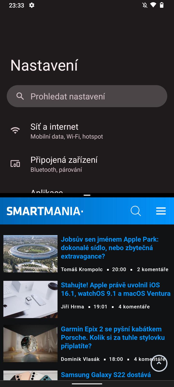 V praxi stačí taková baterie na to, aby zajistila celý náročný pracovní den, respektive i dva dny na home office. K dispozici je tu také spořič baterie, který aktivuje tmavý motiv a omezí – nebo rovnou deaktivuje – operace na pozadí. Nabíjet lze pouze kabelem, a to při maximálním výkonu 15 W, adaptér však musíte mít vlastní. Nádrž zcela naplníte za plus minus 2 hodiny čistého času.